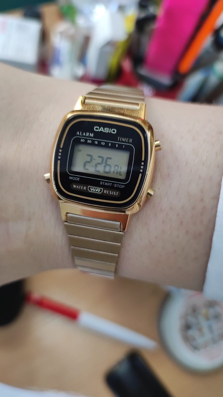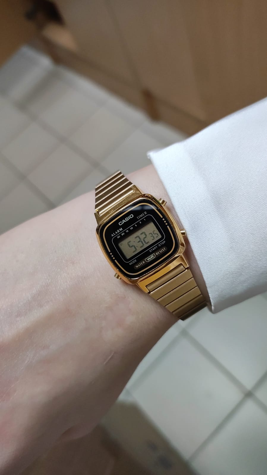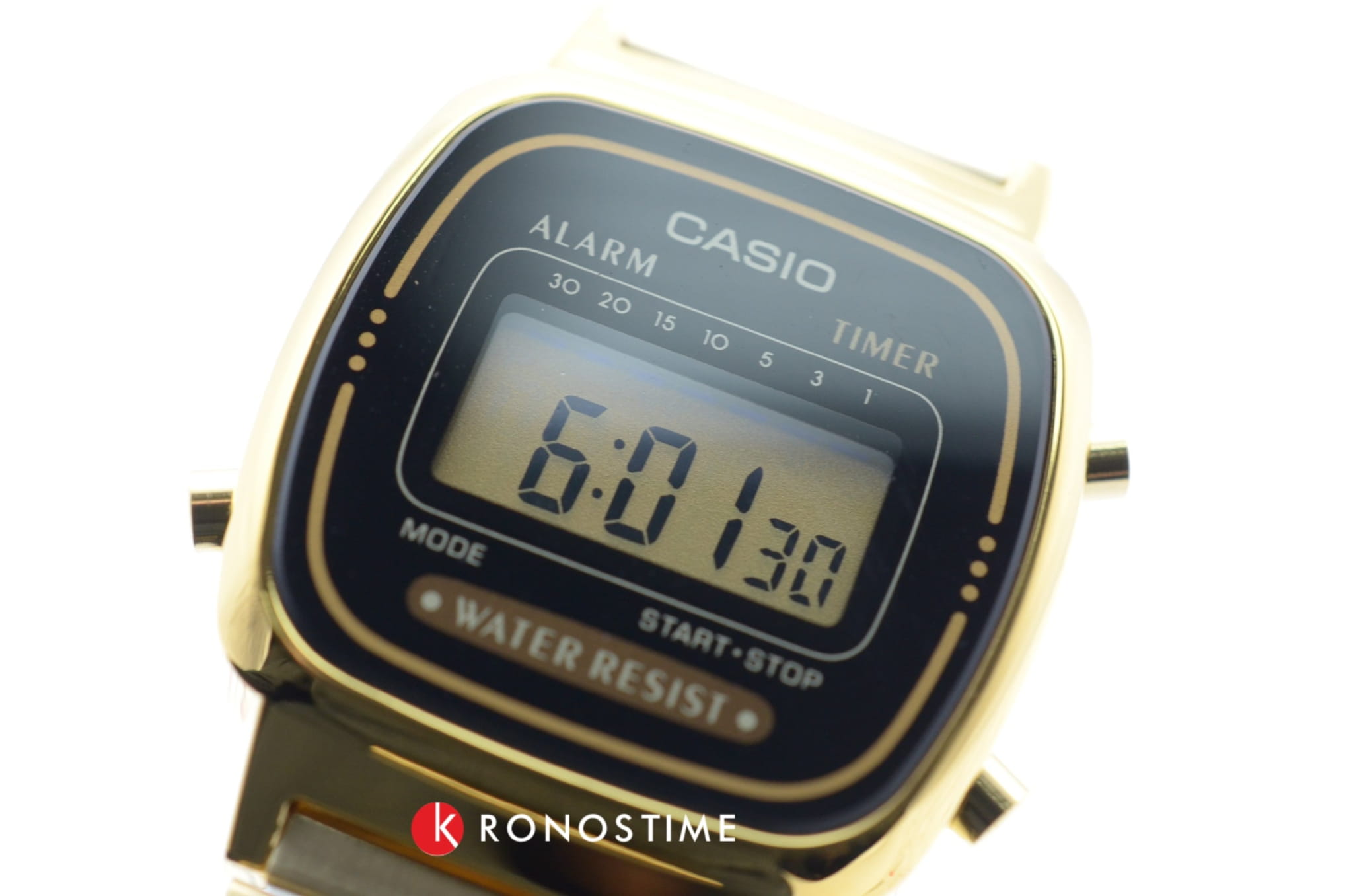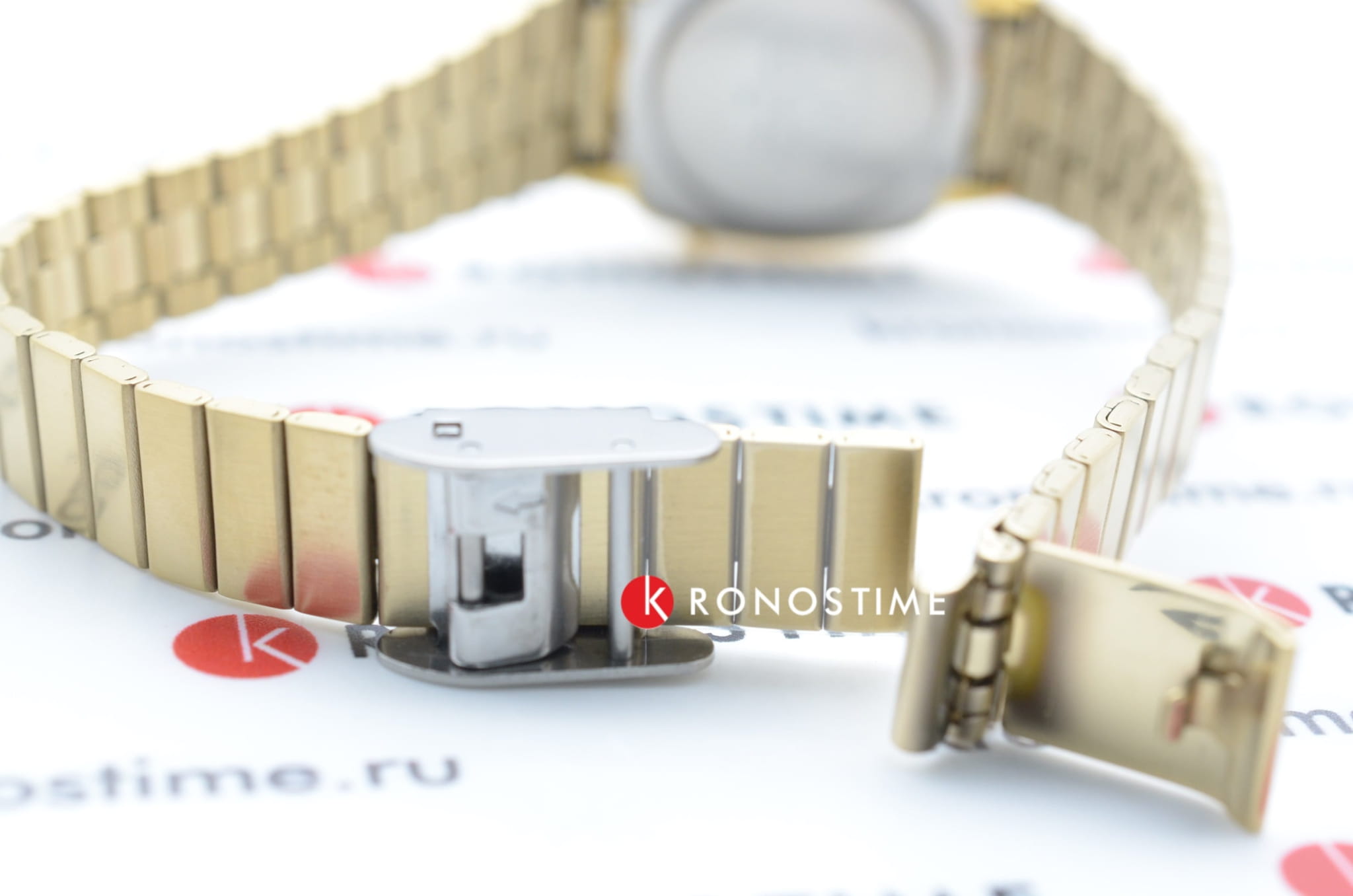 Компактный аксессуар имеет корпус из полимерного материала, защищающего японский кварцевый механизм. Он работает от батарейки, рассчитанной на 2 года. Браслет из нержавеющей стали с золотистым IP-покрытиемIP-покрытиеМетод ионного напыления. Демонстрирует повышенную устойчивость к истиранию, окислению и химическим веществам. Под воздействием высокого давления и температуры около 1500°C молекулы металла надёжно соединяются с частицами корпуса часов. дополнен регулируемым креплением для максимального комфорта носителя. Функции: календарь, секундомер, будильник, таймер.