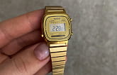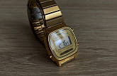 Женские электронные часы. Оснащены функциями: секундомера, таймера, календаря и подсветки. Корпус - Пластиковый; Стекло - Пластик; Водозащита - 30 м. (WR 30); Материал ремешка - Нержавеющая сталь, PVD покрытие; Цвет ремешка - Золотистый; Цвет циферблата - Золотой.