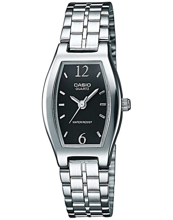 Элегантная модель от Casio отличается привлекательным и удобным дизайном. Выпуклый по бокам корпус выполнен из гипоаллергенной латуни. Черный циферблат выгодно подчеркивает временные отметки серебристого цвета, сделанные в виде штрихов и арабских цифр. Гладкий, серебристый браслет сделан из нержавеющей стали и включает в себя складную застежку. Часы работают от батарейки, срок службы которой составляет 3 года. Вес аксессуара равен 48 граммам.
