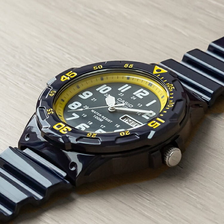 Спортивные японские мужские часы с органическим стеклом Casio Collection MRW-200HC-2B, кварцевый механизм с высокой точностью. Класс водозащиты: 100 метров, позволит плавать, нырять и заниматься другими водными видами спорта. Корпус часов изготовлен из пластика. Пластиковый ремешок на стандартной застёжке. Вращающийся безельБезельВнешний ободок, закрепляющий стекло. В спортивных часах так называется поворотное кольцо с делениями на циферблате, выполняет роль таймера – замеряет отрезки времени на шкале. Неподвижный безель – элемент декора. Однонаправленно вращающийся безель на дайверских часах позволяет фиксировать моменты погружения и выныривания на поверхность. с яркой контрастной разметкой. Акриловое стекло устойчивое к ударному возникновению. Светонакопительное покрытие обеспечивает длительное послесвечение в темноте даже после кратковременного нахождения на свету.