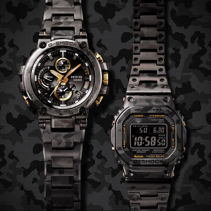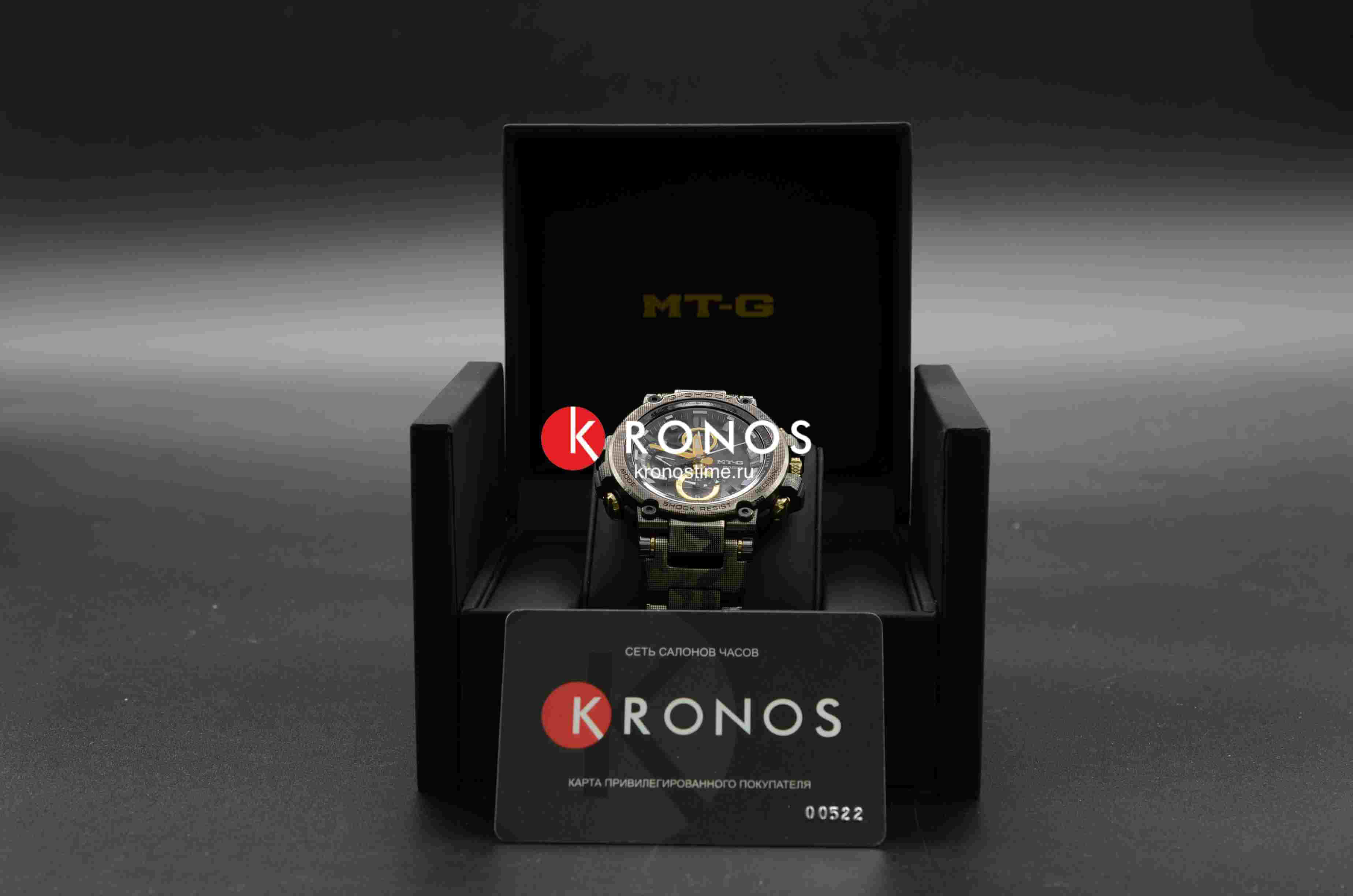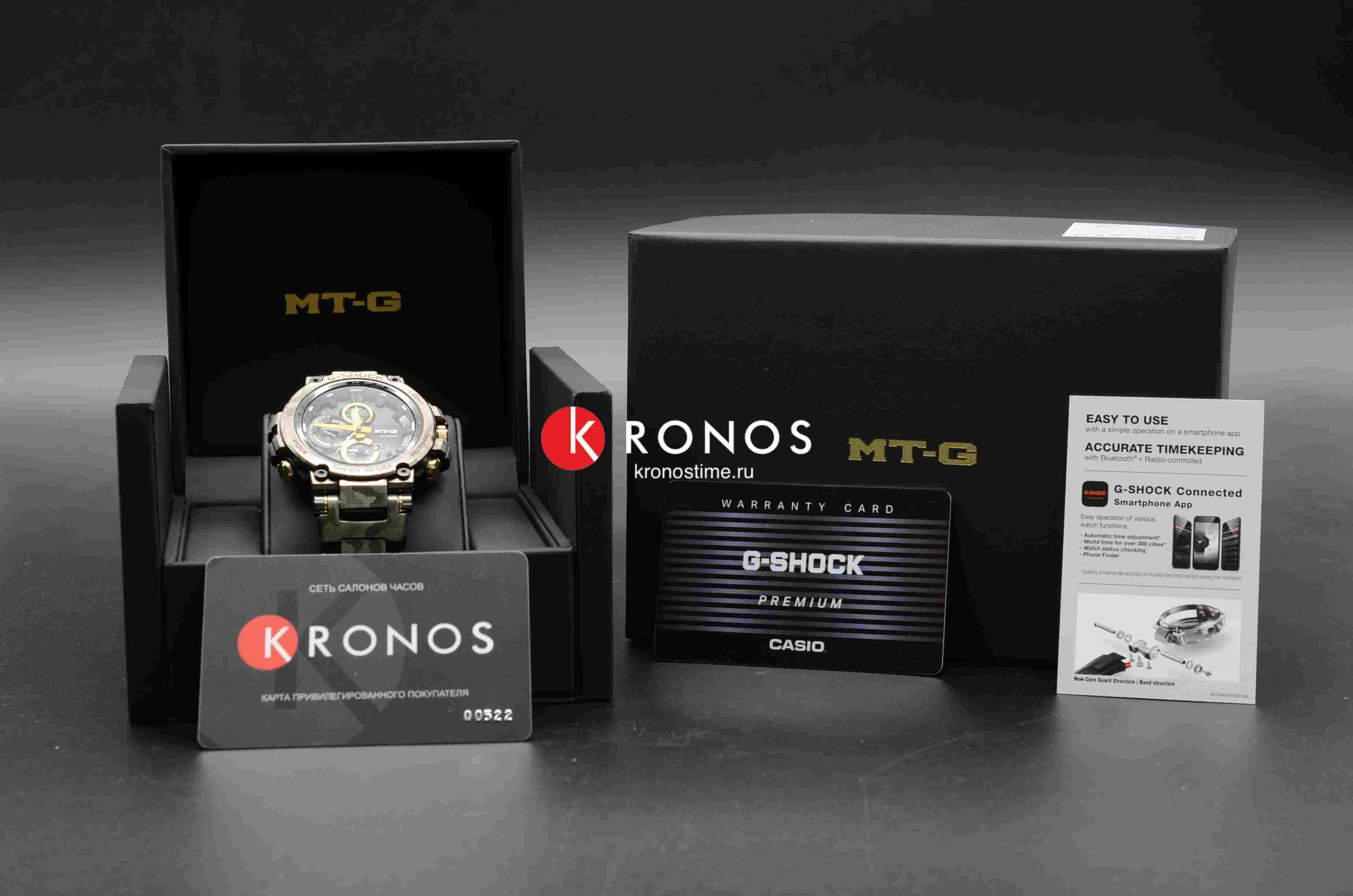 Часы привлекают эксклюзивным внешним видом, камуфляжный принт был нанесён с помощью современной лазерной технологии, работа осуществляется 3 «пискелями» разного диаметра. Традиционный для серии Casio MTG-1000 ударопрочный корпусУдаропрочный корпусМеханизм заключён в корпус, выполненный из современных материалов, устойчивых к ударам, механическим повреждениям и падению с высоты: инновационный пластик, карбон, нержавеющая сталь, титан. с ромбовидным рисунком циферблата дополнен золотистыми деталями. Он выполнен из нержавеющей стали 316L и полимера, дополнительную устойчивость к вибрации и перепадам температур придаёт слой геля Alpha Gel®. Композитный браслет из стали и полимерного материала. Технология . Светодиодная подсветкаСветодиодная подсветкаСветодиодная или LED-подсветка обеспечивает появление яркого холодного свечения за счёт LED-элементов - маленьких лампочек. Они потребляют минимальное количество энергии, чаще всего можно встретить 1 светодиод, в нижней части циферблата. циферблата, люминесцентная подсветкаЛюминесцентное покрытиеПозволяет считывать показания времени в темноте. Производители наносят на стрелки, часовые индексы, безель или поверхность циферблата светонакопительный состав, дающий холодное свечение. Neobrite. Сферическое сапфировое стекло. Надёжное IP-покрытиеIP-покрытиеМетод ионного напыления. Демонстрирует повышенную устойчивость к истиранию, окислению и химическим веществам. Под воздействием высокого давления и температуры около 1500°C молекулы металла надёжно соединяются с частицами корпуса часов.. Функции: BluetoothBluetoothСовременная технология, позволяющая синхронизировать часы с телефоном и переносить данные. Часы с Bluetooth расширяют возможности вашего смартфона и делают его использование ещё более удобным., приём радиосигнала, установление точного времени через синхронизацию с сервером, мировое времяМировое время Полезное часовое усложнение, отображающее время в основных городах и известных областях по всему миру, оно связано с часовыми поясами, удобно для путешественников и бизнесменов. , будильник, секундомер, автоматический календарь до 2099 года, таймер. Габариты: 55,8 x 51,7 x 14,4 мм.