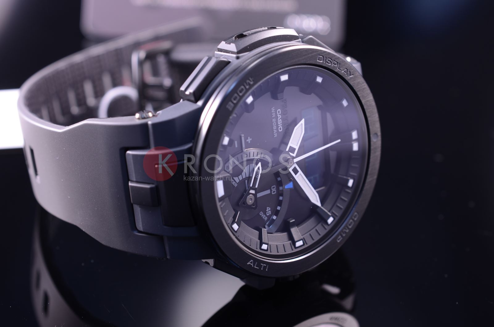 Многофункциональные, ударопрочные наручные кварцевые мужские часы на солнечной батарее. Циферблат темного цвета с контрастными элементами дизайна. Корпус часов выполнен из нержавеющей стали и пластика. На безеле нанесены часовые пояса. Сапфировое стекло, не царапается. Часы надежно удерживаются на руке ремешком из высокопрочного полимерного пластика цвета хаки. Водонепроницаемость 200М. Из дополнительных функций в часах присутствует: вечный календарь, секундомер, таймер обратного отсчета, высотомер, барометр, термометр, компас, индикатор запаса хода, второй часовой пояс, будильник (количество установок: 5), ежечасный сигнал, функция сохранения энергии, функция включения/отключения звука кнопок, функция перемещения стрелок; работоспособность в полной темноте до 6 месяцев в обычном режиме и до 23 месяцев в режиме сохранения энергии, прием радиосигнала для коррекции текущего времени, взрвст луны, уровень прилива.