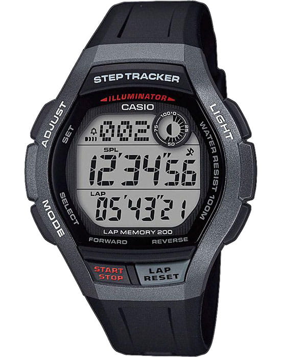 Standard Digital Циферблат подсвечивается светодиодом Мировое время 12-ти и 24-х часовой формат времени Секундомер с точностью показаний 1/100с и временем измерения 24ч Сплит-хронограф Таймер обратного отсчета от 1сек до 1ч Память на 200 кругов Шагомер Возможность включения или выключения звука кнопок