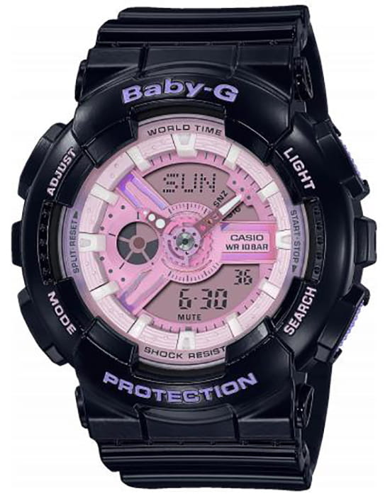 Японские женские часы противоударные Casio Baby-G BA-110PL-1A, кварцевый механизм с высокой точностью. Класс водозащиты: 100 метров, позволит плавать, нырять и заниматься другими водными видами спорта. Корпус часов изготовлен из пластика, цвета.