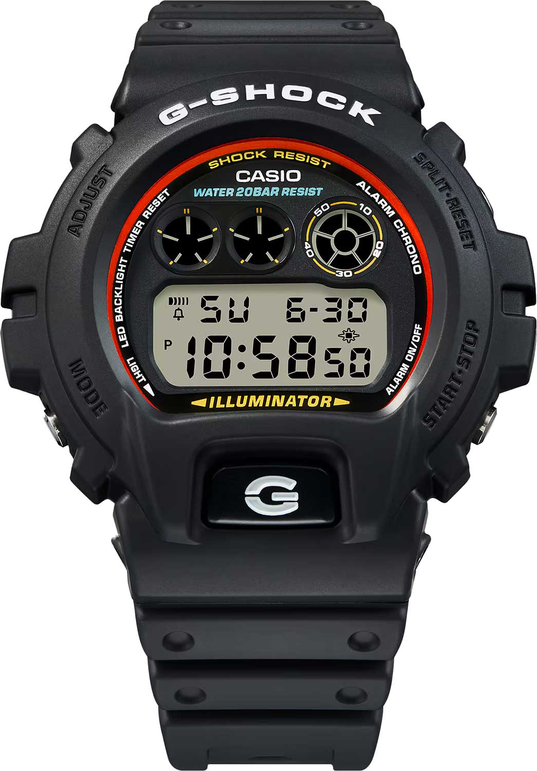 Японские мужские часы Casio G-Shock DW-6900RL-1. В дизайне модели прослеживается визуальная эстетика 90-х годов, что добавляет ей особого шарма в глазах тех, кто помнит первые кассетные плееры SONY и двухкассетники SHARP. Ударопрочный корпусУдаропрочный корпусМеханизм заключён в корпус, выполненный из современных материалов, устойчивых к ударам, механическим повреждениям и падению с высоты: инновационный пластик, карбон, нержавеющая сталь, титан. из полимерного материала защищает механизм от ударов и вибрации. Минеральное стеклоМинеральное стеклоМинеральное стекло представляет собой искусственно выращенный минерал кварца. Такое стекло отличается особой устойчивостью к повреждениям и царапинам. Уступает по некоторым качествам сапфировому стеклу. устойчивое к появлению царапин, обладающее высокой прозрачностью. Светодиодная подсветкаСветодиодная подсветкаСветодиодная или LED-подсветка обеспечивает появление яркого холодного свечения за счёт LED-элементов - маленьких лампочек. Они потребляют минимальное количество энергии, чаще всего можно встретить 1 светодиод, в нижней части циферблата., послесвечение. 12/24-часовой формат. вечный календарьВечный календарьКлассическое часовое усложнение, представляющее собой календарь, рассчитанный на несколько лет вперёд (стандартно – до 2099 года). Определяет текущую дату, день недели, месяц.. СекундомерСекундомерСекундоме́р — прибор, способный измерять интервалы времени с точностью до долей секунды.. ТаймерТаймерОтсчитывает секунды в обратном направлении в заданном интервале времени.. Часовой сигнал времени. Многофункциональный будильник. Класс водозащиты: 200 метров, позволит плавать, нырять и заниматься другими водными видами спорта. Ремешок из полимерного материала на стандартной застежке.