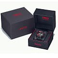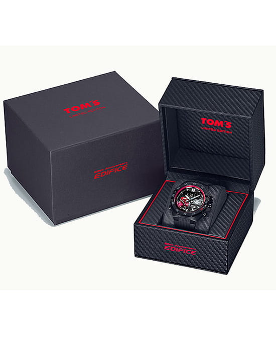 Casio Edifice ECB-10TMS-1A – лимитированная модель, созданная в сотрудничестве с гоночной командой TOM'S в честь 20-летия серии EDIFICE. Корпус размером 51×48,5 мм и толщиной 12,5 мм выполнен из нержавеющей стали с IP-покрытиемIP-покрытиеМетод ионного напыления. Демонстрирует повышенную устойчивость к истиранию, окислению и химическим веществам. Под воздействием высокого давления и температуры около 1500°C молекулы металла надёжно соединяются с частицами корпуса часов. чёрного цвета, обеспечивающим прочность и устойчивость к коррозии. Чёрный циферблат с карбоновыми вставками и аналогово-цифровым отображением времени защищён сапфировым стекломСапфировое стеклоПрочный и надёжный материал из кристалла сапфира синтетического происхождения, характеризующийся особой твёрдостью и устойчивостью к царапинам и повреждениям. с антибликовым покрытиемАнтибликовое покрытиеСлой оксида металла в 0,13-0,3 микрон, благодаря которому стекло часов не бликует и не отражает свет. Антибликовое покрытие уменьшает отражение света в 10 раз, обеспечивая отличную читаемость показателей циферблата., устойчивым к царапинам.