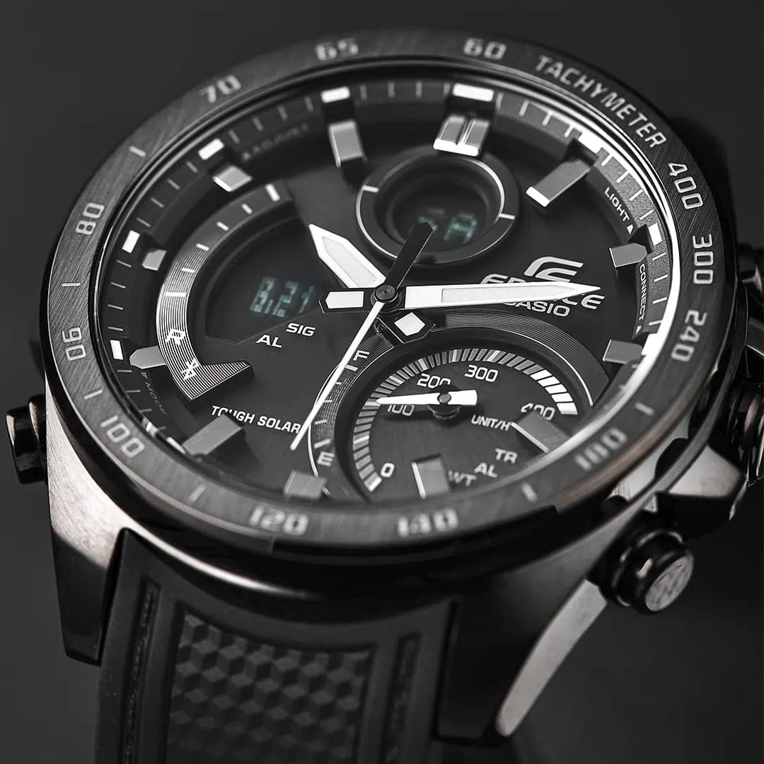 Многофункциональные мужские часы с с минеральным стекломМинеральное стеклоМинеральное стекло представляет собой искусственно выращенный минерал кварца. Такое стекло отличается особой устойчивостью к повреждениям и царапинам. Уступает по некоторым качествам сапфировому стеклу. Casio Edifice ECB-900PB-1A, кварцевый механизм с высокой точностью. Класс водозащиты: 100 метров, позволит плавать, нырять и заниматься другими водными видами спорта. Корпус часов изготовлен из стали с IP-покрытиемIP-покрытиеМетод ионного напыления. Демонстрирует повышенную устойчивость к истиранию, окислению и химическим веществам. Под воздействием высокого давления и температуры около 1500°C молекулы металла надёжно соединяются с частицами корпуса часов.. Питание от солнечной энергии Tough SolarTough SolarТехнология основана на подзарядке аккумулятора от источника солнечного света, специальная панель улавливает солнечные лучи и преобразует их в энергию для работы часов. Достаточно пары минут нахождения на солнце для функционирования часов в течении суток. - высокоэффективная солнечная батарея, аккумулятор, индикатор низкого заряда батареи. Функция автоматического сохранения энергии. Время работы аккумулятора без подзарядки приблизительно 6 месяцев, при включенной функции сохранения энергии приблизительно 19 месяцев. Двойная подсветка Super Illuminator с функцией Afterglow (для подсветки не нужно удерживать кнопку, время послесвечения настраивается 1,5 или 3 сек): одновременно подсвечивается аналоговый циферблат и цифровой дисплей. Цвет подсветки: белый. Подсветка NeobriteПодсветка NeobriteИспользование светонакопительных составов на основе сульфида цинка или алюмината стронция, яркий свет можно наблюдать на протяжении 6-10 часов после «зарядки» часов около источника света. обеспечивает длительное послесвечение в темноте даже после кратковременного нахождения на свету. Сплит-хронографСплит-хронографИспользуется для измерения продолжительности нескольких временных отрезков, начинающихся одновременно, а заканчивающихся в разное время. с тахиметромТахиметрРазмеченная шкала, располагается на ободке или безеле часов. Тахиметр позволяет рассчитать скорость на определённом участке пути, расстояние измеряется в километрах или милях.. Мировое время Мировое время Полезное часовое усложнение, отображающее время в основных городах и известных областях по всему миру, оно связано с часовыми поясами, удобно для путешественников и бизнесменов. – 39 городов (39 часовых поясов). Функция включения/отключения летнего времени. СекундомерСекундомерСекундоме́р — прибор, способный измерять интервалы времени с точностью до долей секунды. с разрешениями показаний: 1/1000 сек (до 1 ч) и 1/10 сек (после 1 ч) и временем измерения 24 ч. ТаймерТаймерОтсчитывает секунды в обратном направлении в заданном интервале времени. обратного отсчета от 1 сек до 24 ч. 12-ти и 24-х часовой формат времени. Беспроводная технология Bluetooth со сверхнизким потреблением энергии для синхронизации со смартфоном. При подключении к смартфону часы автоматически корректируют текущее время, в том числе переход на зимнее/летнее время, копируют настройки мирового времени более чем для 300 городов, оповещают при поступлении звонка на мобильный телефон. Функция поиска телефона, настройка таймера и будильника. Приложение EDIFICE Connected позво