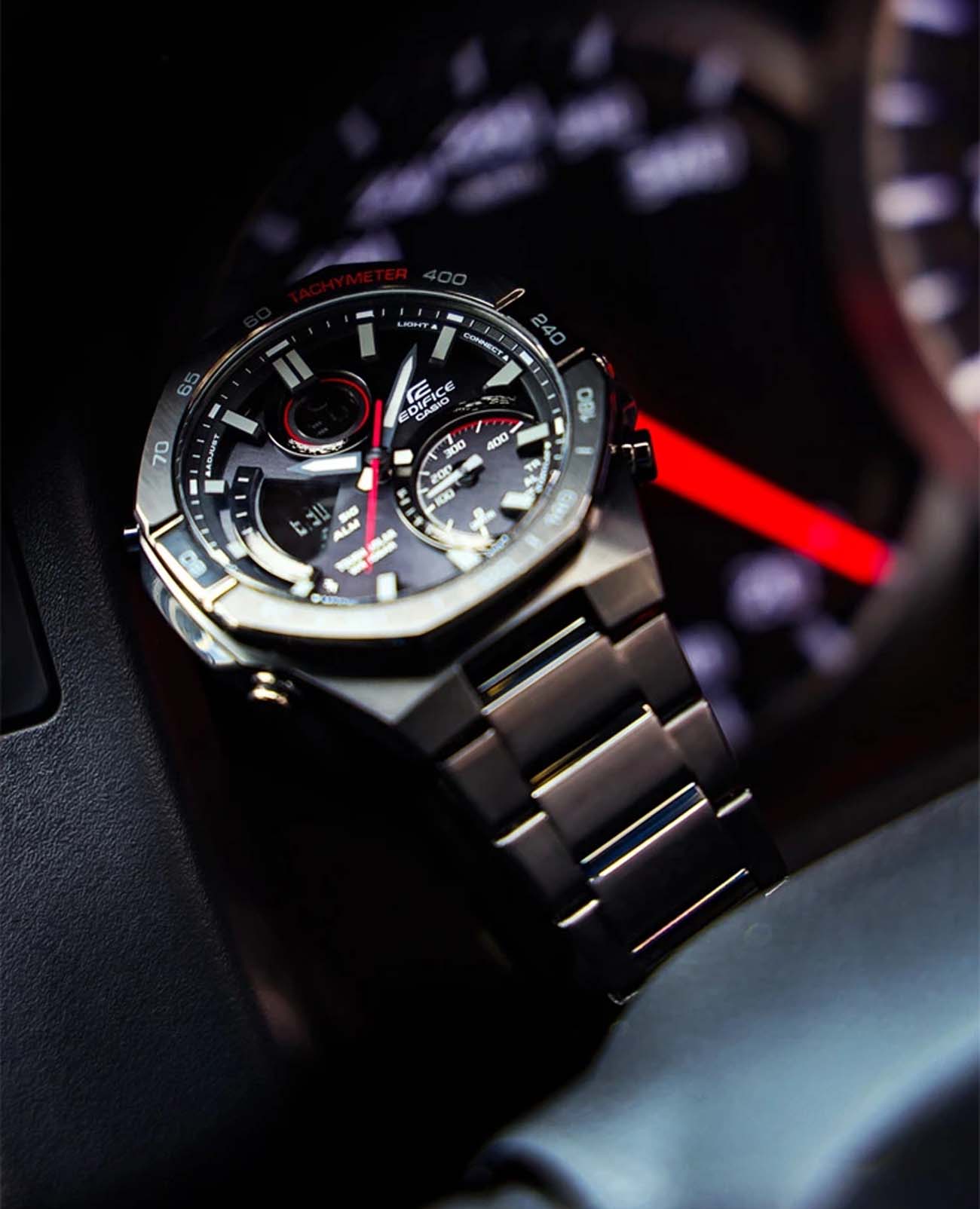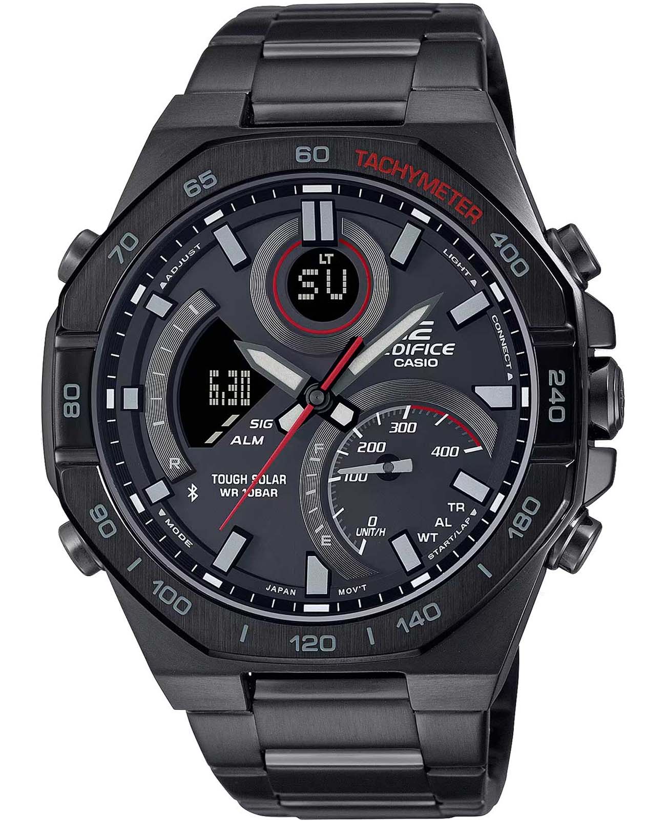 Японские мужские часы-хронографХронографФункция позволяет измерять отрезки времени с особой точностью: часы, минуты, секунды. Верным признаком хронографа является наличие на циферблате 3 дополнительных окошек-счётчиков. Casio Edifice ECB-950DC-1A . Tough SolarTough SolarТехнология основана на подзарядке аккумулятора от источника солнечного света, специальная панель улавливает солнечные лучи и преобразует их в энергию для работы часов. Достаточно пары минут нахождения на солнце для функционирования часов в течении суток., индикатор низкого заряда батареи. Функция автоматического сохранения энергии. Время работы аккумулятора без подзарядки приблизительно 6 месяцев, при включенной функции сохранения энергии приблизительно 19 месяцев. Двойная подсветка Super Illuminator с функцией Afterglow, одновременно подсвечивается аналоговый циферблат и цифровой дисплей. Люминесцентное покрытиеЛюминесцентное покрытиеПозволяет считывать показания времени в темноте. Производители наносят на стрелки, часовые индексы, безель или поверхность циферблата светонакопительный состав, дающий холодное свечение. Neobrite обеспечивает длительное послесвечение в темноте даже после кратковременного нахождения на свету. Таймер обратного отсчета от 1 сек до 24 ч. Мировое время – 39 городов (39 часовых поясов). Автоматический переход на зимнее и летнее время. Беспроводная технология BluetoothBluetoothСовременная технология, позволяющая синхронизировать часы с телефоном и переносить данные. Часы с Bluetooth расширяют возможности вашего смартфона и делают его использование ещё более удобным.. Приложение EDIFICE Connected позволяет вести журнал показаний секундомера и прохождения этапов, вычислять разность между заданным временем и временем этапа. Память на 200 этапов. Измерение скорости отображается на ретроградном циферблате в положении 4 часа. Функция перемещения стрелок для беспрепятственного просмотра информации на цифровых дисплеях, включения/отключения звука и поиска телефона. Заводная головка с защитой. Браслет с тройной раскладывающейся застежкой, расстегиваемой одним касанием. Стальной корпус, защищенный минеральным стекломМинеральное стеклоМинеральное стекло представляет собой искусственно выращенный минерал кварца. Такое стекло отличается особой устойчивостью к повреждениям и царапинам. Уступает по некоторым качествам сапфировому стеклу.. Стальной браслет на раскладной застёжкеРаскладная застёжкаТакой тип застёжки используется только на браслетах из металла. Она никогда не раскрывается полностью, происходит разделение на 2 и более частей. Раскладывающая застёжка снизит вероятность потери часов к минимуму.. СекундомерСекундомерСекундоме́р — прибор, способный измерять интервалы времени с точностью до долей секунды.. Класс водозащиты: 100 метров, позволит плавать, нырять и заниматься другими водными видами спорта.
