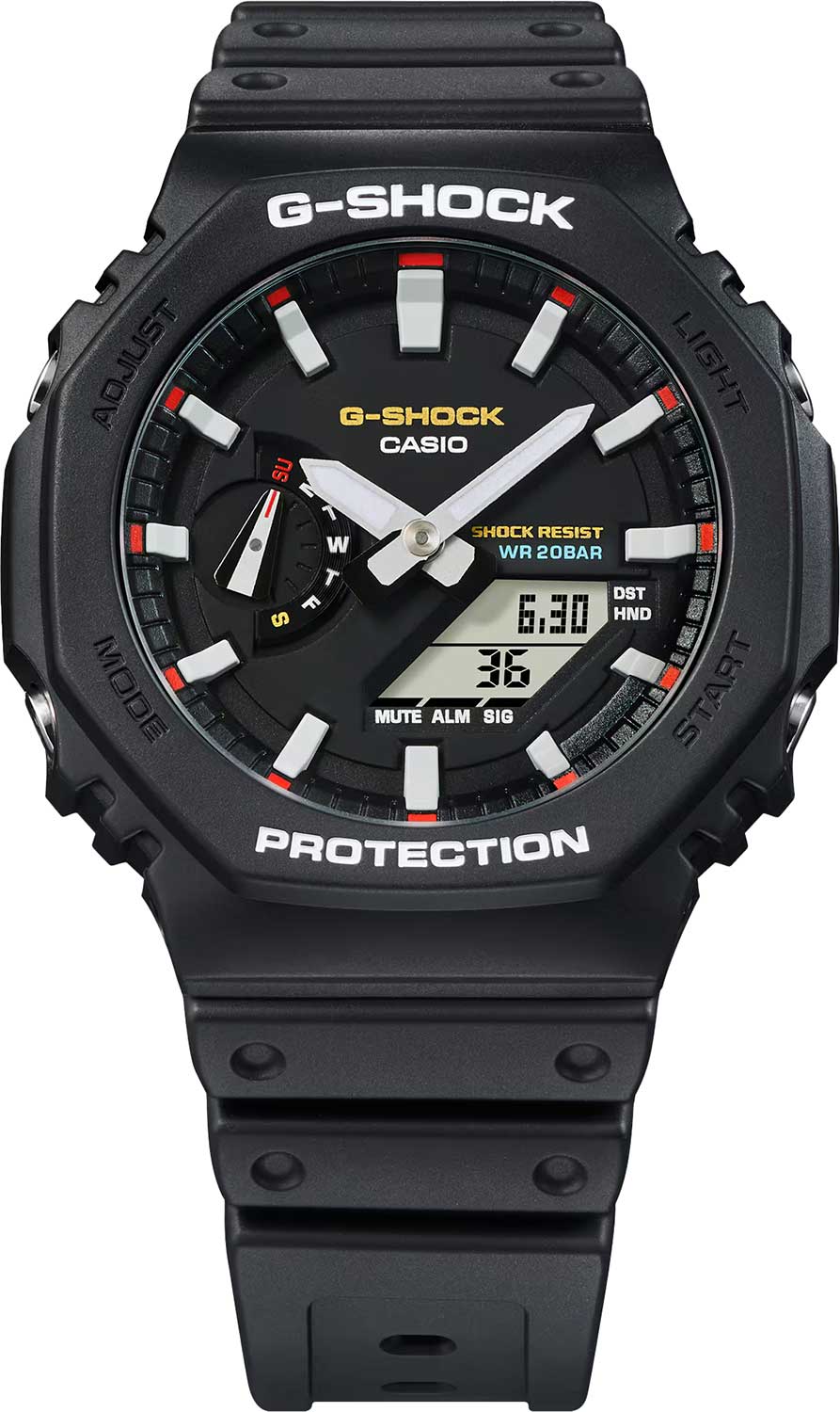 Японские мужские противоударныеУдаропрочный корпусМеханизм заключён в корпус, выполненный из современных материалов, устойчивых к ударам, механическим повреждениям и падению с высоты: инновационный пластик, карбон, нержавеющая сталь, титан. часы Casio G-Shock GA-2100RL-1A с функциональной начинкой прекрасно подойдут для любителей активного образа жизни. Противоударный пластиковый корпус с карбоновыми волокнами более прочный и, в то же время, более легкий. Этот же материал защищает внутренний модуль от повреждений и деформаций при ударах. Минеральное стеклоМинеральное стеклоМинеральное стекло представляет собой искусственно выращенный минерал кварца. Такое стекло отличается особой устойчивостью к повреждениям и царапинам. Уступает по некоторым качествам сапфировому стеклу. устойчивое к мелким механическим повреждениям. Полностью автоматическая светодиодная подсветкаСветодиодная подсветкаСветодиодная или LED-подсветка обеспечивает появление яркого холодного свечения за счёт LED-элементов - маленьких лампочек. Они потребляют минимальное количество энергии, чаще всего можно встретить 1 светодиод, в нижней части циферблата., выбираемая продолжительность подсветки (2 секунды или 4 секунды), послесвечение. 12-ти и 24-х часовой формат времени. СекундомерСекундомерСекундоме́р — прибор, способный измерять интервалы времени с точностью до долей секунды. с двумя точностями показаний: 1/100с (до 1ч) и 1с (после 1ч) и временем измерения 24ч. ТаймерТаймерОтсчитывает секунды в обратном направлении в заданном интервале времени. обратного отсчета от 1c до 24ч с автоповтором. Мировое время Мировое время Полезное часовое усложнение, отображающее время в основных городах и известных областях по всему миру, оно связано с часовыми поясами, удобно для путешественников и бизнесменов. – 31 часовой пояс (48 городов + всемирное координированное время (UTCUTCВсемирное кординационное время, не имеющее привязки к географическому положению Гринвича, основывается на атомном отсчёте времени. Регулировка времени осуществляется более точно, чем устаревшее GMT.
