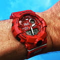 Внешний вид напоминает о боксерских перчатках. Ярко-красный аксессуар подходит для людей, которые следят за здоровьем и регулярно посещают тренировки. Этому способствует шагомер со звуковым напоминанием об отсутствии активности и технология BluetoothBluetoothСовременная технология, позволяющая синхронизировать часы с телефоном и переносить данные. Часы с Bluetooth расширяют возможности вашего смартфона и делают его использование ещё более удобным. с низким потреблением энергии. Часы синхронизируются с приложением G-SHOCK Connected Phone, в котором можно установить ежедневную норму шагов, рассчитать сожжённые калории. Японский кварцевый механизм получает питание от аккумулятора, рассчитанного на 2 года службы. Противоударный корпусУдаропрочный корпусМеханизм заключён в корпус, выполненный из современных материалов, устойчивых к ударам, механическим повреждениям и падению с высоты: инновационный пластик, карбон, нержавеющая сталь, титан. из пластика. Функция перемещения стрелок для лёгкого доступа к данным на цифровых дисплеях. Включение и выключение звука кнопок. Полимерный ремешок. Минеральное стекло. Водонепроницаемость 200 метров. Автоматическая светодиодная подсветкаСветодиодная подсветкаСветодиодная или LED-подсветка обеспечивает появление яркого холодного свечения за счёт LED-элементов - маленьких лампочек. Они потребляют минимальное количество энергии, чаще всего можно встретить 1 светодиод, в нижней части циферблата., стрелки с люминесцентным покрытием NeobriteПодсветка NeobriteИспользование светонакопительных составов на основе сульфида цинка или алюмината стронция, яркий свет можно наблюдать на протяжении 6-10 часов после «зарядки» часов около источника света.. Возможности: секундомер с памятью на 200 кругов, мировое времяМировое время Полезное часовое усложнение, отображающее время в основных городах и известных областях по всему миру, оно связано с часовыми поясами, удобно для путешественников и бизнесменов. , таймер обратного отсчёта, 5 будильников, календарь до 2099 года, хронографХронографФункция позволяет измерять отрезки времени с особой точностью: часы, минуты, секунды. Верным признаком хронографа является наличие на циферблате 3 дополнительных окошек-счётчиков.. Габариты: 54,1 x 48,6 x 15,5 мм.