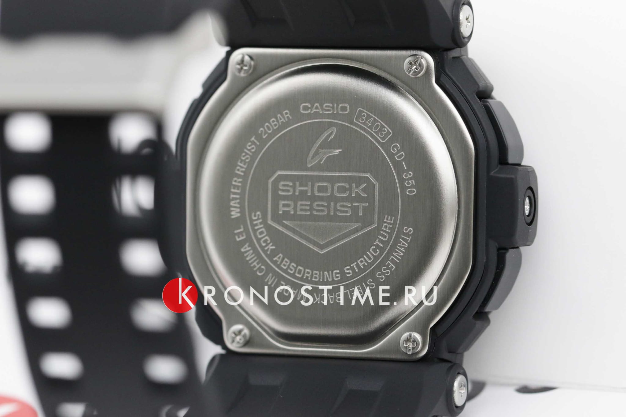 Многофункциональные ударопрочныеУдаропрочный корпусМеханизм заключён в корпус, выполненный из современных материалов, устойчивых к ударам, механическим повреждениям и падению с высоты: инновационный пластик, карбон, нержавеющая сталь, титан. спортивные мужские часы Casio G-Shock GD-350-1B, электронный механизм с высокой точностью. Класс водозащиты: 200 метров, позволит плавать, нырять и заниматься другими водными видами спорта. Корпус часов изготовлен из пластика. Часы оснащены функцией вибро, звукового и светового оповещения. Циферблат с светодиодной подсветкойСветодиодная подсветкаСветодиодная или LED-подсветка обеспечивает появление яркого холодного свечения за счёт LED-элементов - маленьких лампочек. Они потребляют минимальное количество энергии, чаще всего можно встретить 1 светодиод, в нижней части циферблата., при недостаточном освещении во время поворота запястья в сторону лица подсветка включается автоматически. Ударопрочный корпусУдаропрочный корпусМеханизм заключён в корпус, выполненный из современных материалов, устойчивых к ударам, механическим повреждениям и падению с высоты: инновационный пластик, карбон, нержавеющая сталь, титан. защищает механизм от ударов и вибрации. СекундомерСекундомерСекундоме́р — прибор, способный измерять интервалы времени с точностью до долей секунды. с точностью показаний 1/100с и временем измерения 1000ч. Сплит-хронографСплит-хронографИспользуется для измерения продолжительности нескольких временных отрезков, начинающихся одновременно, а заканчивающихся в разное время.. ТаймерТаймерОтсчитывает секунды в обратном направлении в заданном интервале времени. обратного отсчета от 1мин до 24ч. Мировое времяМировое время Полезное часовое усложнение, отображающее время в основных городах и известных областях по всему миру, оно связано с часовыми поясами, удобно для путешественников и бизнесменов. . 12-ти и 24-х часовой формат времени. Индикатор низкого заряда батареи. Функция включения/отключения звука. Световая и вибрационная индикация сигнала.