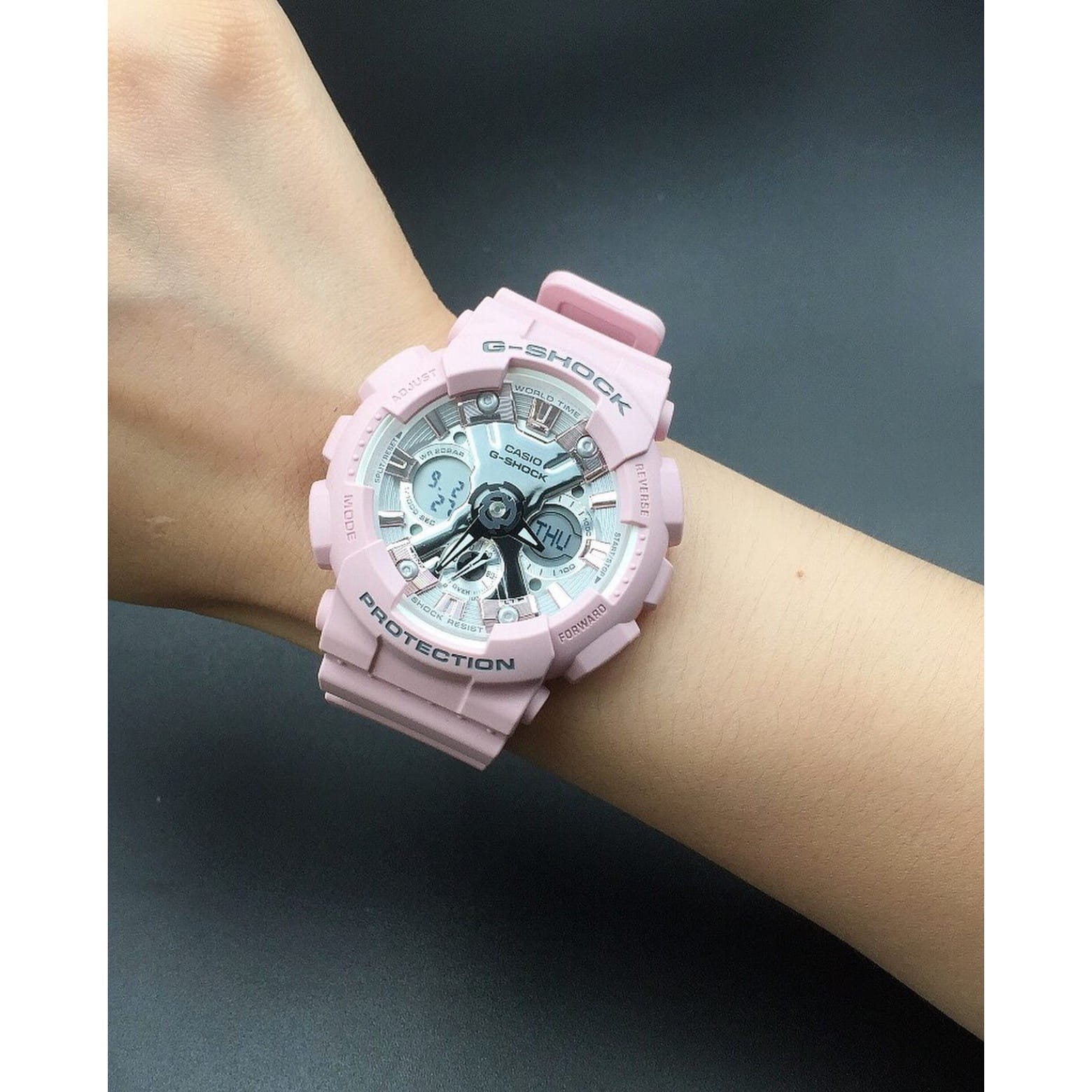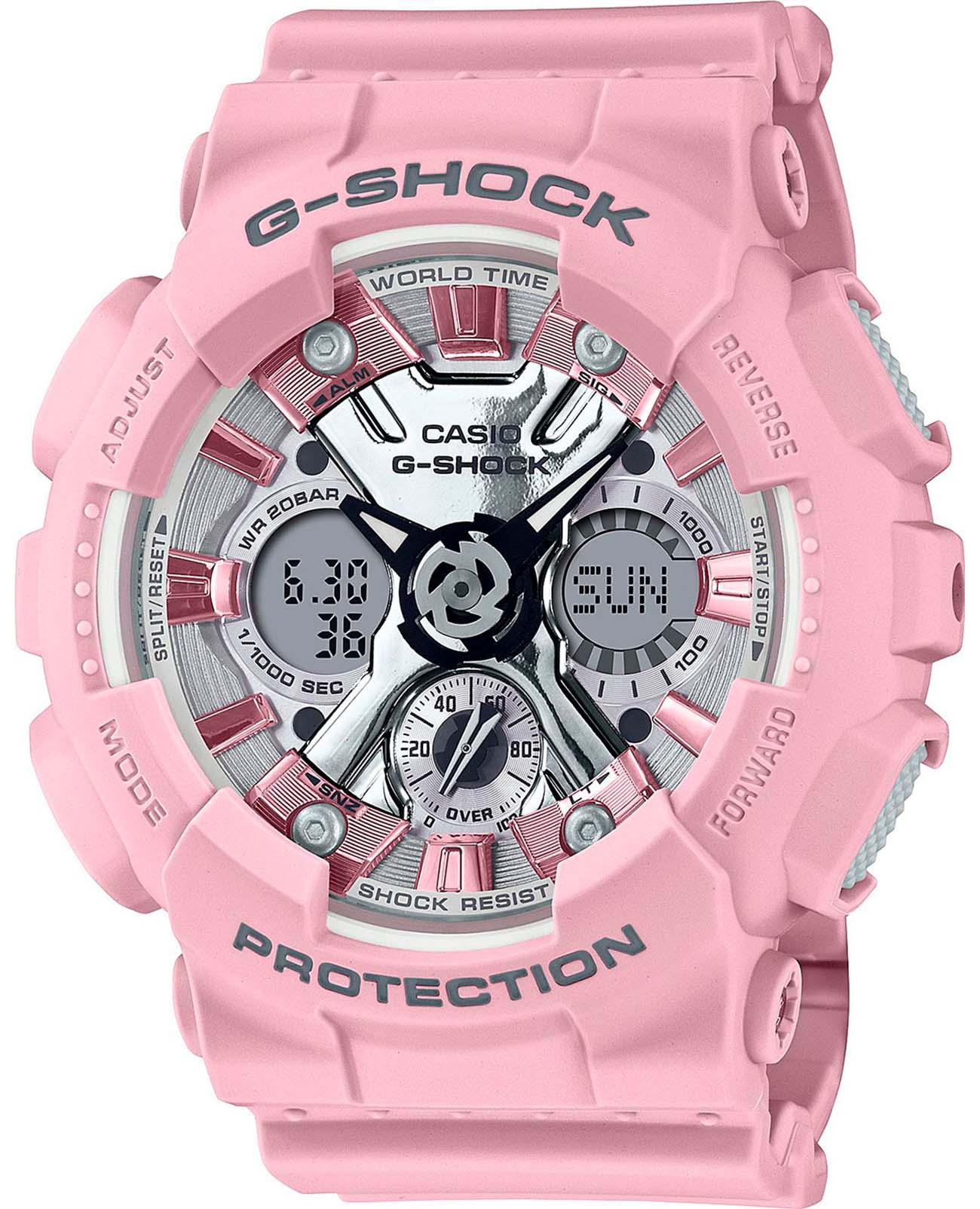 Японские женские часы GMA-S120NP-4A из коллекции G-Shock представлены в спортивном облачении. Кварцевые часы. Аналогово-цифровой циферблат. Наручные часы с противоударным корпусомУдаропрочный корпусМеханизм заключён в корпус, выполненный из современных материалов, устойчивых к ударам, механическим повреждениям и падению с высоты: инновационный пластик, карбон, нержавеющая сталь, титан. выполнены из полимерного материала, легко поглощающего силу удара и вибрации, что делает их надёжным и долговечным аксессуаром. Кварцевый механизм японского производства. Батарейка рассчитана на 3 года службы. Стрелки со светодиодной подсветкойСветодиодная подсветкаСветодиодная или LED-подсветка обеспечивает появление яркого холодного свечения за счёт LED-элементов - маленьких лампочек. Они потребляют минимальное количество энергии, чаще всего можно встретить 1 светодиод, в нижней части циферблата.. Минеральное стеклоМинеральное стеклоМинеральное стекло представляет собой искусственно выращенный минерал кварца. Такое стекло отличается особой устойчивостью к повреждениям и царапинам. Уступает по некоторым качествам сапфировому стеклу.. Защита от магнитных полей. Водонепроницаемость 200 метров, позволит плавать, нырять и заниматься другими водными видами спорта. Функциональные возможности: мировое времяМировое время Полезное часовое усложнение, отображающее время в основных городах и известных областях по всему миру, оно связано с часовыми поясами, удобно для путешественников и бизнесменов. , таймерТаймерОтсчитывает секунды в обратном направлении в заданном интервале времени. обратного отсчёта, будильникБудильникБуди́льник — часы, в заданный момент времени подающие звуковой, световой и/или в редких случаях другой сигнал., хронографХронографФункция позволяет измерять отрезки времени с особой точностью: часы, минуты, секунды. Верным признаком хронографа является наличие на циферблате 3 дополнительных окошек-счётчиков., автоматический календарь до 2099 года, UTCUTCВсемирное кординационное время, не имеющее привязки к географическому положению Гринвича, основывается на атомном отсчёте времени. Регулировка времени осуществляется более точно, чем устаревшее GMT.