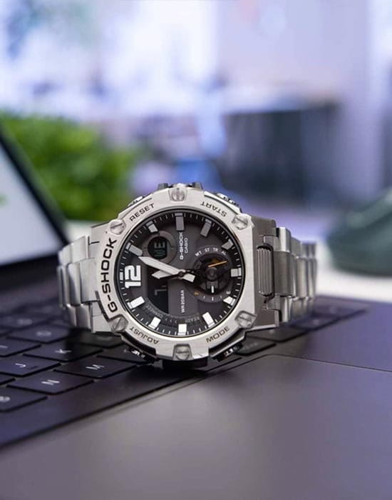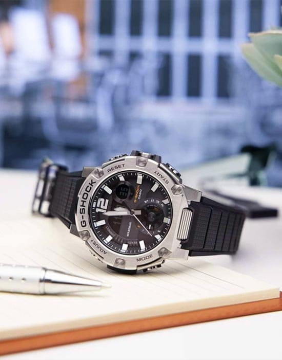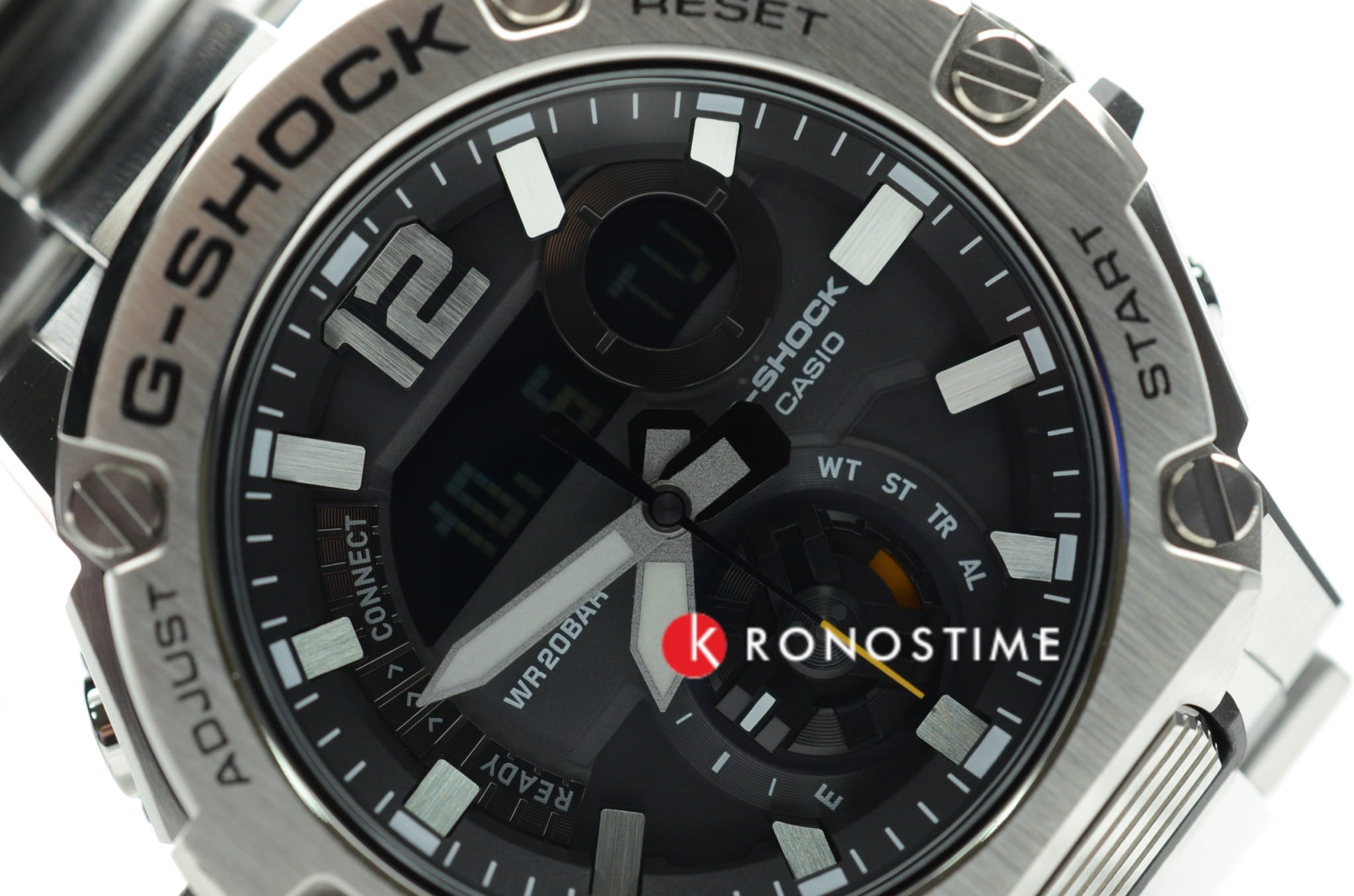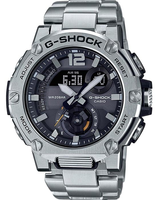 Японские мужские часы Casio G-Shock GST-B300E-5AER привлекают брутальным спортивным дизайном. Корпус имеет структуру Carbon Core GuardCarbon Core Guard Новейшая структура корпуса, разработанная Casio. Полиуретановая пластина дополнительно усилена карбоновыми вставками, что придаёт специальную защиту от механических повреждений. Карбон отличается лёгкостью и прочностью., что говорит о повышенной ударопрочности. БезельБезельВнешний ободок, закрепляющий стекло. В спортивных часах так называется поворотное кольцо с делениями на циферблате, выполняет роль таймера – замеряет отрезки времени на шкале. Неподвижный безель – элемент декора. Однонаправленно вращающийся безель на дайверских часах позволяет фиксировать моменты погружения и выныривания на поверхность. и браслет изготовлены из стали 316L. Японский кварцевый механизм отличается высокой точностью хода 15 +/- секунд в месяц. Часы оснащены инновационной технологией , синхронизация со смартфоном происходит с помощью BluetoothBluetoothСовременная технология, позволяющая синхронизировать часы с телефоном и переносить данные. Часы с Bluetooth расширяют возможности вашего смартфона и делают его использование ещё более удобным.. Возможности: двойная автоматическая подсветка, мировое времяМировое время Полезное часовое усложнение, отображающее время в основных городах и известных областях по всему миру, оно связано с часовыми поясами, удобно для путешественников и бизнесменов. , будильник, хронографХронографФункция позволяет измерять отрезки времени с особой точностью: часы, минуты, секунды. Верным признаком хронографа является наличие на циферблате 3 дополнительных окошек-счётчиков., календарь, таймер.