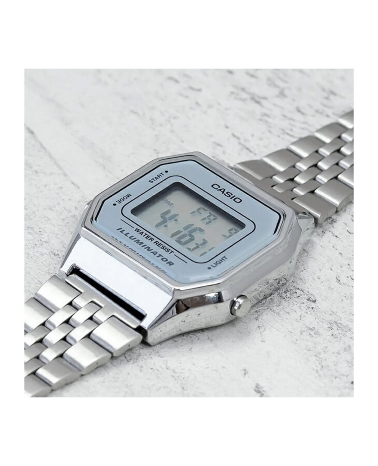 Японские женские часы-хронографХронографФункция позволяет измерять отрезки времени с особой точностью: часы, минуты, секунды. Верным признаком хронографа является наличие на циферблате 3 дополнительных окошек-счётчиков. с органическим стеклом Casio Vintage LA680WA-7DF, кварцевый механизм с высокой точностью. Корпус часов изготовлен из пластика. СекундомерСекундомерСекундоме́р — прибор, способный измерять интервалы времени с точностью до долей секунды. с точностью измерения 1/100 секунды и измерением 1 ч. 12-ти и 24-х часовой формат времени. БудильникБудильникБуди́льник — часы, в заданный момент времени подающие звуковой, световой и/или в редких случаях другой сигнал., ежечасный сигнал. Автоматический календарь: число, день недели. Батарея рассчитана на 5 лет. Класс водозащиты: 30 метров, позволит защитить корпус от случайных брызг или капель дождя. Стальной браслет на раскладной застёжкеРаскладная застёжкаТакой тип застёжки используется только на браслетах из металла. Она никогда не раскрывается полностью, происходит разделение на 2 и более частей. Раскладывающая застёжка снизит вероятность потери часов к минимуму..