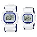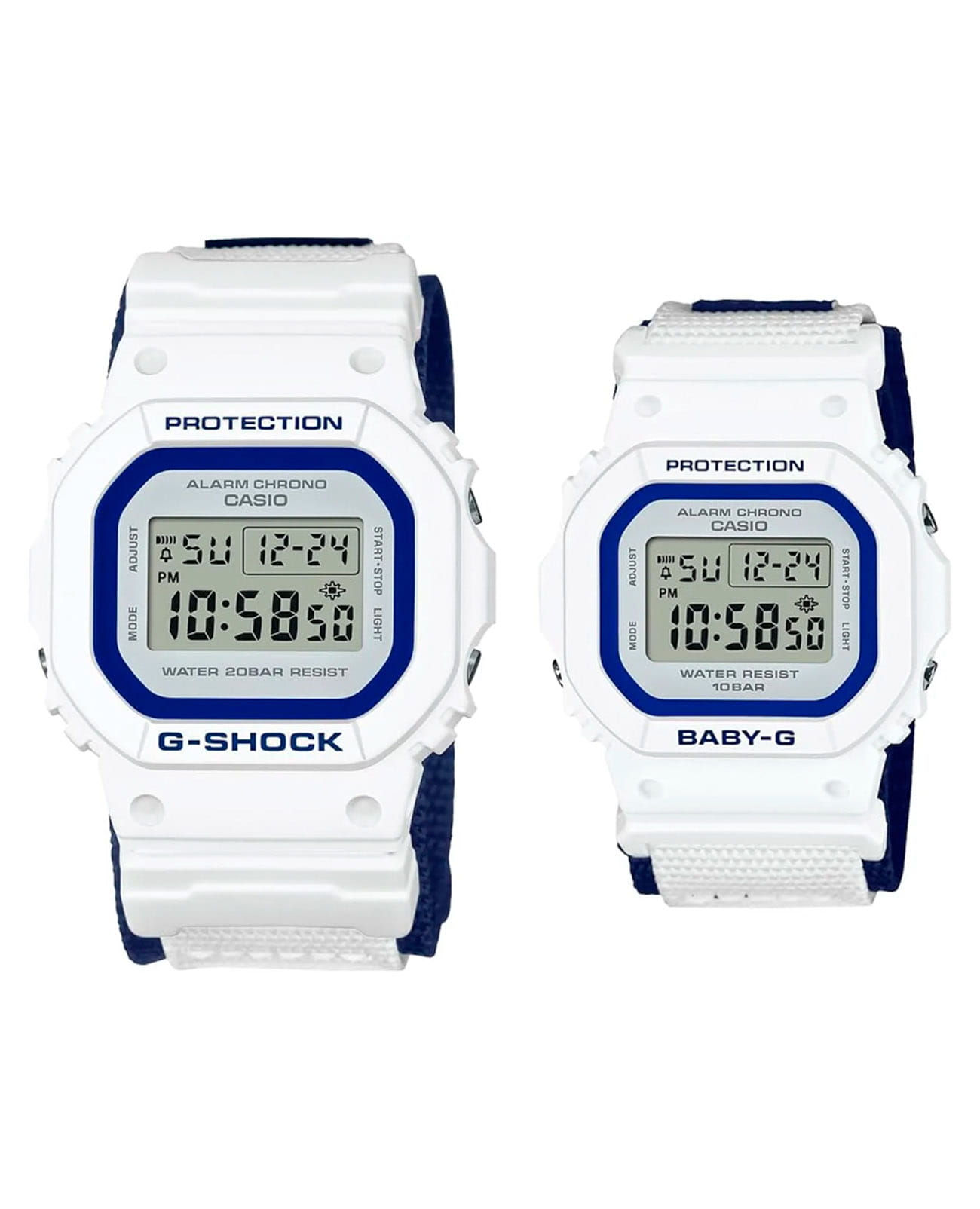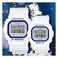 В этом году G представляет коллекцию Lover's Collection LOV-23A-7, в которую входят G-Shock DW-5600 и Baby-G BGD-565. В часах использованы белый и синий цвета и тканевые ремешки первой коллекции Lover's, выпущенной в 1996 году. Эти часы, выпущенные ограниченным тиражом, украшены вышитыми ангелом и дьяволом бирками на нижних ремешках, графическими изображениями red angel (BGD-565) и devil (DW-5600) на светодиодной подсветкеСветодиодная подсветкаСветодиодная или LED-подсветка обеспечивает появление яркого холодного свечения за счёт LED-элементов - маленьких лампочек. Они потребляют минимальное количество энергии, чаще всего можно встретить 1 светодиод, в нижней части циферблата. и специальной гравировкой Lover's Collection на задней крышке корпуса из нержавеющей стали. Обе пары имеют ударопрочный корпусУдаропрочный корпусМеханизм заключён в корпус, выполненный из современных материалов, устойчивых к ударам, механическим повреждениям и падению с высоты: инновационный пластик, карбон, нержавеющая сталь, титан., часовой сигнал времени, секундомерСекундомерСекундоме́р — прибор, способный измерять интервалы времени с точностью до долей секунды., таймерТаймерОтсчитывает секунды в обратном направлении в заданном интервале времени., многофункциональный будильникБудильникБуди́льник — часы, в заданный момент времени подающие звуковой, световой и/или в редких случаях другой сигнал., 12 и 24-часовой формат времени, вечный календарьВечный календарьКлассическое часовое усложнение, представляющее собой календарь, рассчитанный на несколько лет вперёд (стандартно – до 2099 года). Определяет текущую дату, день недели, месяц.. Стилизованная светодиодная подсветкаСветодиодная подсветкаСветодиодная или LED-подсветка обеспечивает появление яркого холодного свечения за счёт LED-элементов - маленьких лампочек. Они потребляют минимальное количество энергии, чаще всего можно встретить 1 светодиод, в нижней части циферблата. освещает весь циферблат, после отпускания кнопки свечение продолжается еще некоторое время. Тканевый ремешок на стандартной застежке. G-Shock DW-5600 имеет вес 57гр, парметры: 48.9 × 42.8 × 13.4 мм. Класс водозащиты: 200 метров, позволит плавать, нырять и заниматься другими водными видами спорта. Baby-G BGD-565 имеет вес 35гр, параметры: 42.1 × 37.9 × 11.3 мм. Класс водозащиты: 100 метров, позволит плавать, нырять и заниматься другими водными видами спорта.