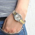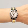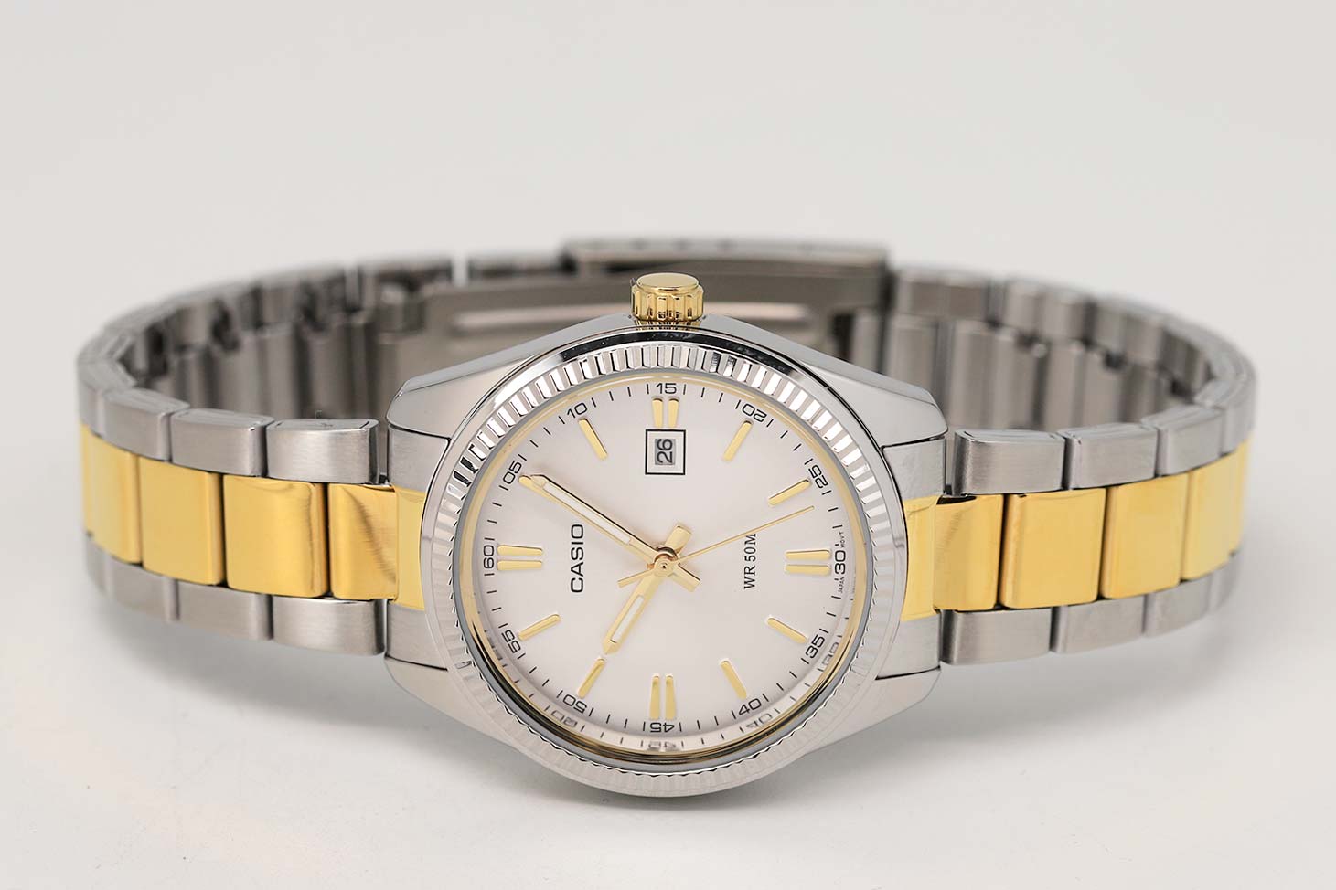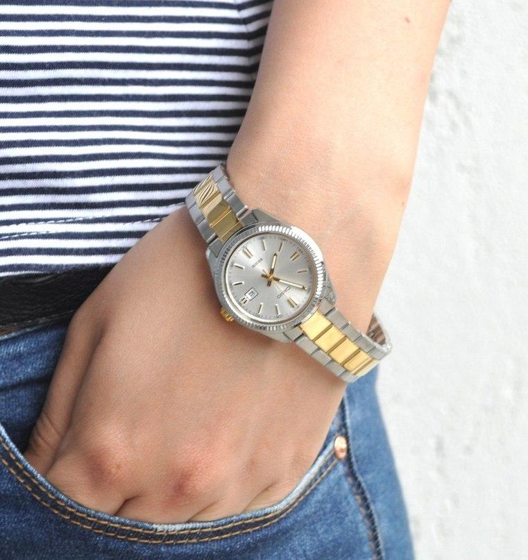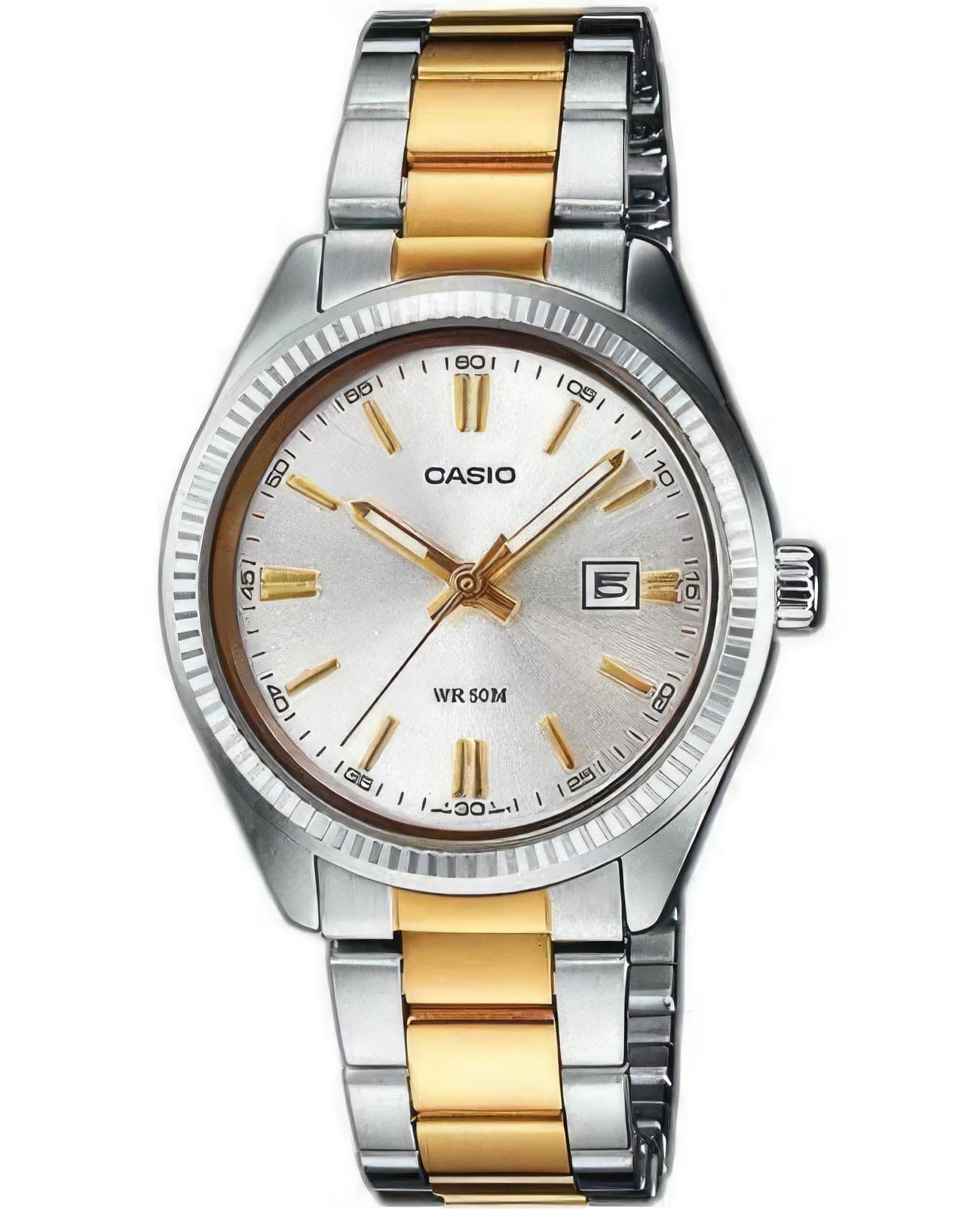 Японские женские часы Casio Collection LTP-1302SG-7A с минеральным стекломМинеральное стеклоМинеральное стекло представляет собой искусственно выращенный минерал кварца. Такое стекло отличается особой устойчивостью к повреждениям и царапинам. Уступает по некоторым качествам сапфировому стеклу.. Светящееся покрытие обеспечивает длительную подсветку в темное время суток после короткого воздействия света. Корпус выполнен из гипоаллергенной латуни. Модель комплектуется надёжным механизмом, точность хода которого составляет +/- 20 сек/мес. Стрелки с люминесцентным покрытиемЛюминесцентное покрытиеПозволяет считывать показания времени в темноте. Производители наносят на стрелки, часовые индексы, безель или поверхность циферблата светонакопительный состав, дающий холодное свечение.. Стальной браслет на раскладной застёжкеРаскладная застёжкаТакой тип застёжки используется только на браслетах из металла. Она никогда не раскрывается полностью, происходит разделение на 2 и более частей. Раскладывающая застёжка снизит вероятность потери часов к минимуму. с IP-покрытиемIP-покрытиеМетод ионного напыления. Демонстрирует повышенную устойчивость к истиранию, окислению и химическим веществам. Под воздействием высокого давления и температуры около 1500°C молекулы металла надёжно соединяются с частицами корпуса часов.. Окошко даты находится в положении 3 часа. Водонепроницаемость 50 метров, позволит защитить корпус от случайных брызг или капель дождя.