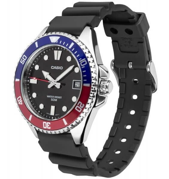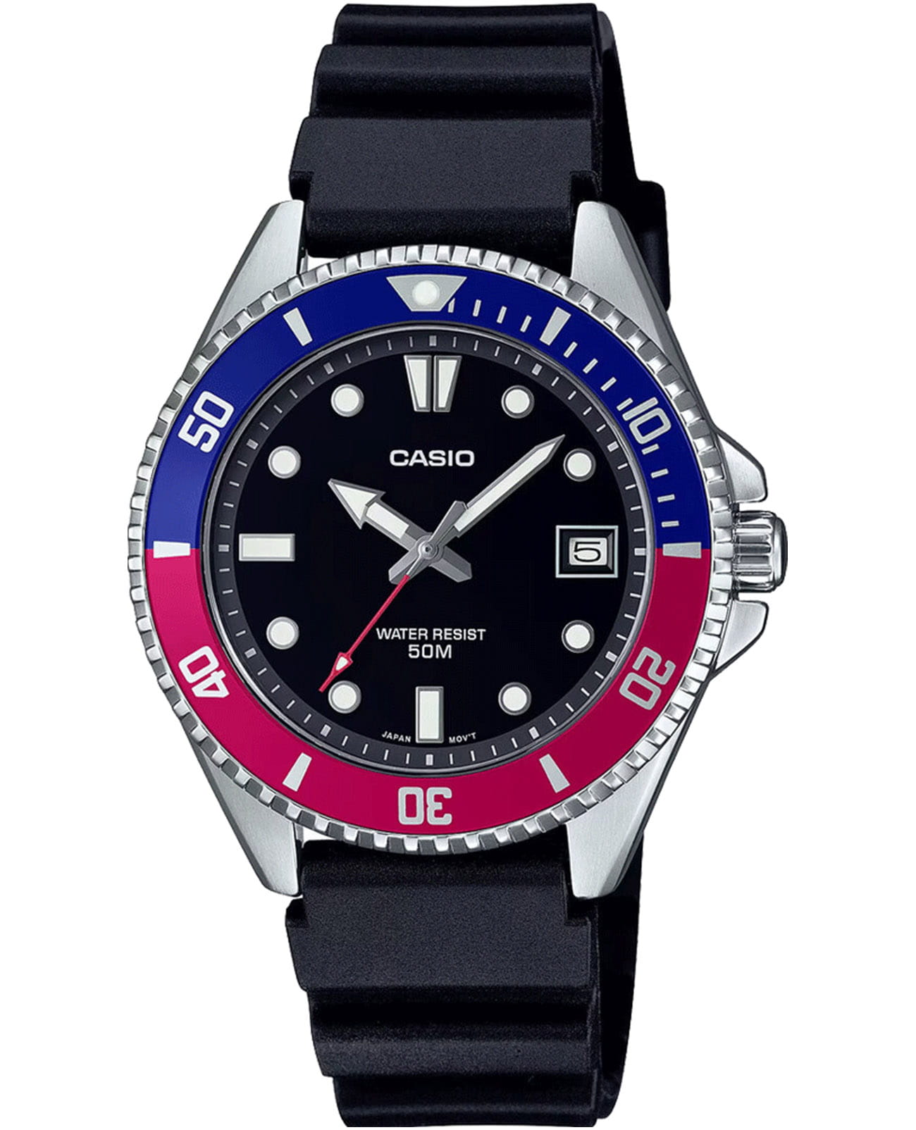 Японские мужские кварцевые часы с минеральным стекломМинеральное стеклоМинеральное стекло представляет собой искусственно выращенный минерал кварца. Такое стекло отличается особой устойчивостью к повреждениям и царапинам. Уступает по некоторым качествам сапфировому стеклу. Casio Collection MDV-10-1A2VEF, кварцевый механизм с высокой точностью. Корпус часов изготовлен из нержавеющей стали. Вращающийся безельБезельВнешний ободок, закрепляющий стекло. В спортивных часах так называется поворотное кольцо с делениями на циферблате, выполняет роль таймера – замеряет отрезки времени на шкале. Неподвижный безель – элемент декора. Однонаправленно вращающийся безель на дайверских часах позволяет фиксировать моменты погружения и выныривания на поверхность. из нержавеющей стали с IP-покрытиемIP-покрытиеМетод ионного напыления. Демонстрирует повышенную устойчивость к истиранию, окислению и химическим веществам. Под воздействием высокого давления и температуры около 1500°C молекулы металла надёжно соединяются с частицами корпуса часов.. Стрелки и метки с люминесцентным покрытиемЛюминесцентное покрытиеПозволяет считывать показания времени в темноте. Производители наносят на стрелки, часовые индексы, безель или поверхность циферблата светонакопительный состав, дающий холодное свечение.. Окошко даты находится в положении 3 часа. Класс водозащиты: 50 метров, позволит защитить корпус от случайных брызг или капель дождя. Ремешок с классической застежкой.