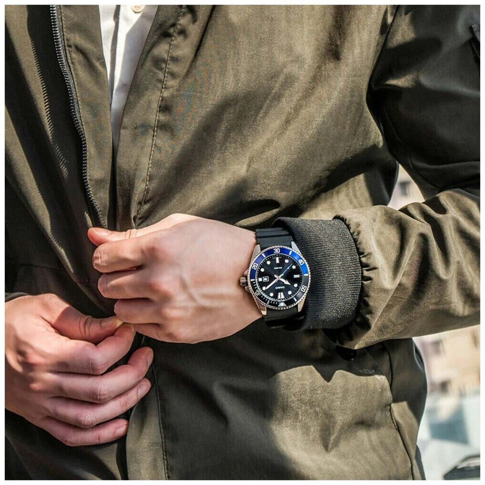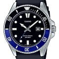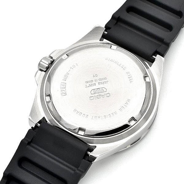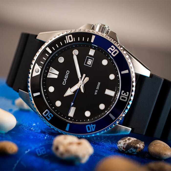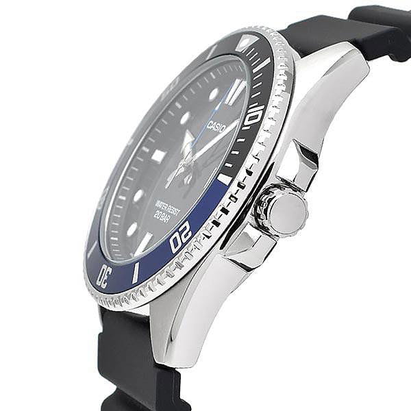 Японские мужские кварцевые часы с минеральным стекломМинеральное стеклоМинеральное стекло представляет собой искусственно выращенный минерал кварца. Такое стекло отличается особой устойчивостью к повреждениям и царапинам. Уступает по некоторым качествам сапфировому стеклу. Casio Collection MDV-107-1A2, кварцевый механизм с высокой точностью. Корпус часов изготовлен из нержавеющей стали. Вращающийся безельБезельВнешний ободок, закрепляющий стекло. В спортивных часах так называется поворотное кольцо с делениями на циферблате, выполняет роль таймера – замеряет отрезки времени на шкале. Неподвижный безель – элемент декора. Однонаправленно вращающийся безель на дайверских часах позволяет фиксировать моменты погружения и выныривания на поверхность. из нержавеющей стали с IP-покрытиемIP-покрытиеМетод ионного напыления. Демонстрирует повышенную устойчивость к истиранию, окислению и химическим веществам. Под воздействием высокого давления и температуры около 1500°C молекулы металла надёжно соединяются с частицами корпуса часов.. Стрелки с люминесцентным покрытиемЛюминесцентное покрытиеПозволяет считывать показания времени в темноте. Производители наносят на стрелки, часовые индексы, безель или поверхность циферблата светонакопительный состав, дающий холодное свечение.. Окошко даты находится в положении 3 часа. Класс водозащиты: 200 метров, позволит плавать, нырять и заниматься другими водными видами спорта. Ремешок с классической застежкой.
