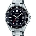 Японские мужские кварцевые часы с минеральным стекломМинеральное стеклоМинеральное стекло представляет собой искусственно выращенный минерал кварца. Такое стекло отличается особой устойчивостью к повреждениям и царапинам. Уступает по некоторым качествам сапфировому стеклу. Casio Collection MDV-10D-1A1VEF, кварцевый механизм с высокой точностью. Корпус и браслет часов изготовлены из нержавеющей стали. Вращающийся безельБезельВнешний ободок, закрепляющий стекло. В спортивных часах так называется поворотное кольцо с делениями на циферблате, выполняет роль таймера – замеряет отрезки времени на шкале. Неподвижный безель – элемент декора. Однонаправленно вращающийся безель на дайверских часах позволяет фиксировать моменты погружения и выныривания на поверхность. из нержавеющей стали с IP-покрытиемIP-покрытиеМетод ионного напыления. Демонстрирует повышенную устойчивость к истиранию, окислению и химическим веществам. Под воздействием высокого давления и температуры около 1500°C молекулы металла надёжно соединяются с частицами корпуса часов.. Стрелки и метки с люминесцентным покрытиемЛюминесцентное покрытиеПозволяет считывать показания времени в темноте. Производители наносят на стрелки, часовые индексы, безель или поверхность циферблата светонакопительный состав, дающий холодное свечение.. Окошко даты находится в положении 3 часа. Класс водозащиты: 50 метров, позволит защитить корпус от случайных брызг или капель дождя.