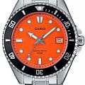 Японские мужские кварцевые часы с минеральным стекломМинеральное стеклоМинеральное стекло представляет собой искусственно выращенный минерал кварца. Такое стекло отличается особой устойчивостью к повреждениям и царапинам. Уступает по некоторым качествам сапфировому стеклу. Casio Collection MDV-10D-4A1V, кварцевый механизм с высокой точностью. Корпус и браслет часов изготовлены из нержавеющей стали. Вращающийся безельБезельВнешний ободок, закрепляющий стекло. В спортивных часах так называется поворотное кольцо с делениями на циферблате, выполняет роль таймера – замеряет отрезки времени на шкале. Неподвижный безель – элемент декора. Однонаправленно вращающийся безель на дайверских часах позволяет фиксировать моменты погружения и выныривания на поверхность. из нержавеющей стали с IP-покрытиемIP-покрытиеМетод ионного напыления. Демонстрирует повышенную устойчивость к истиранию, окислению и химическим веществам. Под воздействием высокого давления и температуры около 1500°C молекулы металла надёжно соединяются с частицами корпуса часов.. Стрелки и метки с люминесцентным покрытиемЛюминесцентное покрытиеПозволяет считывать показания времени в темноте. Производители наносят на стрелки, часовые индексы, безель или поверхность циферблата светонакопительный состав, дающий холодное свечение.. Окошко даты находится в положении 3 часа. Класс водозащиты: 50 метров, позволит защитить корпус от случайных брызг или капель дождя.