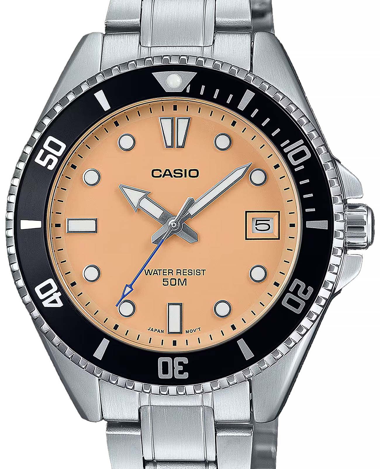 Японские мужские кварцевые часы с минеральным стекломМинеральное стеклоМинеральное стекло представляет собой искусственно выращенный минерал кварца. Такое стекло отличается особой устойчивостью к повреждениям и царапинам. Уступает по некоторым качествам сапфировому стеклу. Casio Collection MDV-10D-4A2V, кварцевый механизм с высокой точностью. Корпус и браслет часов изготовлены из нержавеющей стали. Вращающийся безельБезельВнешний ободок, закрепляющий стекло. В спортивных часах так называется поворотное кольцо с делениями на циферблате, выполняет роль таймера – замеряет отрезки времени на шкале. Неподвижный безель – элемент декора. Однонаправленно вращающийся безель на дайверских часах позволяет фиксировать моменты погружения и выныривания на поверхность. из нержавеющей стали с IP-покрытиемIP-покрытиеМетод ионного напыления. Демонстрирует повышенную устойчивость к истиранию, окислению и химическим веществам. Под воздействием высокого давления и температуры около 1500°C молекулы металла надёжно соединяются с частицами корпуса часов.. Стрелки и метки с люминесцентным покрытиемЛюминесцентное покрытиеПозволяет считывать показания времени в темноте. Производители наносят на стрелки, часовые индексы, безель или поверхность циферблата светонакопительный состав, дающий холодное свечение.. Окошко даты находится в положении 3 часа. Класс водозащиты: 50 метров, позволит защитить корпус от случайных брызг или капель дождя.