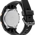 Аксессуар с фактурным циферблатом наделён противоударным корпусомУдаропрочный корпусМеханизм заключён в корпус, выполненный из современных материалов, устойчивых к ударам, механическим повреждениям и падению с высоты: инновационный пластик, карбон, нержавеющая сталь, титан. из полимерного пластика. Для усиления устойчивости к ударам безельБезельВнешний ободок, закрепляющий стекло. В спортивных часах так называется поворотное кольцо с делениями на циферблате, выполняет роль таймера – замеряет отрезки времени на шкале. Неподвижный безель – элемент декора. Однонаправленно вращающийся безель на дайверских часах позволяет фиксировать моменты погружения и выныривания на поверхность. сделан из хирургической стали 316L с IP-покрытиемIP-покрытиеМетод ионного напыления. Демонстрирует повышенную устойчивость к истиранию, окислению и химическим веществам. Под воздействием высокого давления и температуры около 1500°C молекулы металла надёжно соединяются с частицами корпуса часов.. Японский кварцевый механизм. Чёрный полимерный ремешок с узорчатой поверхностью. Минеральное стеклоМинеральное стеклоМинеральное стекло представляет собой искусственно выращенный минерал кварца. Такое стекло отличается особой устойчивостью к повреждениям и царапинам. Уступает по некоторым качествам сапфировому стеклу. с закалкой. Водозащита до 10 бар. ЛюминесцентнаяЛюминесцентное покрытиеПозволяет считывать показания времени в темноте. Производители наносят на стрелки, часовые индексы, безель или поверхность циферблата светонакопительный состав, дающий холодное свечение. подсветка стрелок и светодиодная подсветкаСветодиодная подсветкаСветодиодная или LED-подсветка обеспечивает появление яркого холодного свечения за счёт LED-элементов - маленьких лампочек. Они потребляют минимальное количество энергии, чаще всего можно встретить 1 светодиод, в нижней части циферблата. циферблата. Будильник, таймер, секундомер с точностью в 1/100 секунды, хронографХронографФункция позволяет измерять отрезки времени с особой точностью: часы, минуты, секунды. Верным признаком хронографа является наличие на циферблате 3 дополнительных окошек-счётчиков., ежечасный сигнал, мировое времяМировое время Полезное часовое усложнение, отображающее время в основных городах и известных областях по всему миру, оно связано с часовыми поясами, удобно для путешественников и бизнесменов. . Габариты: 45,3 x 40,3 x 12,1 мм.