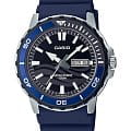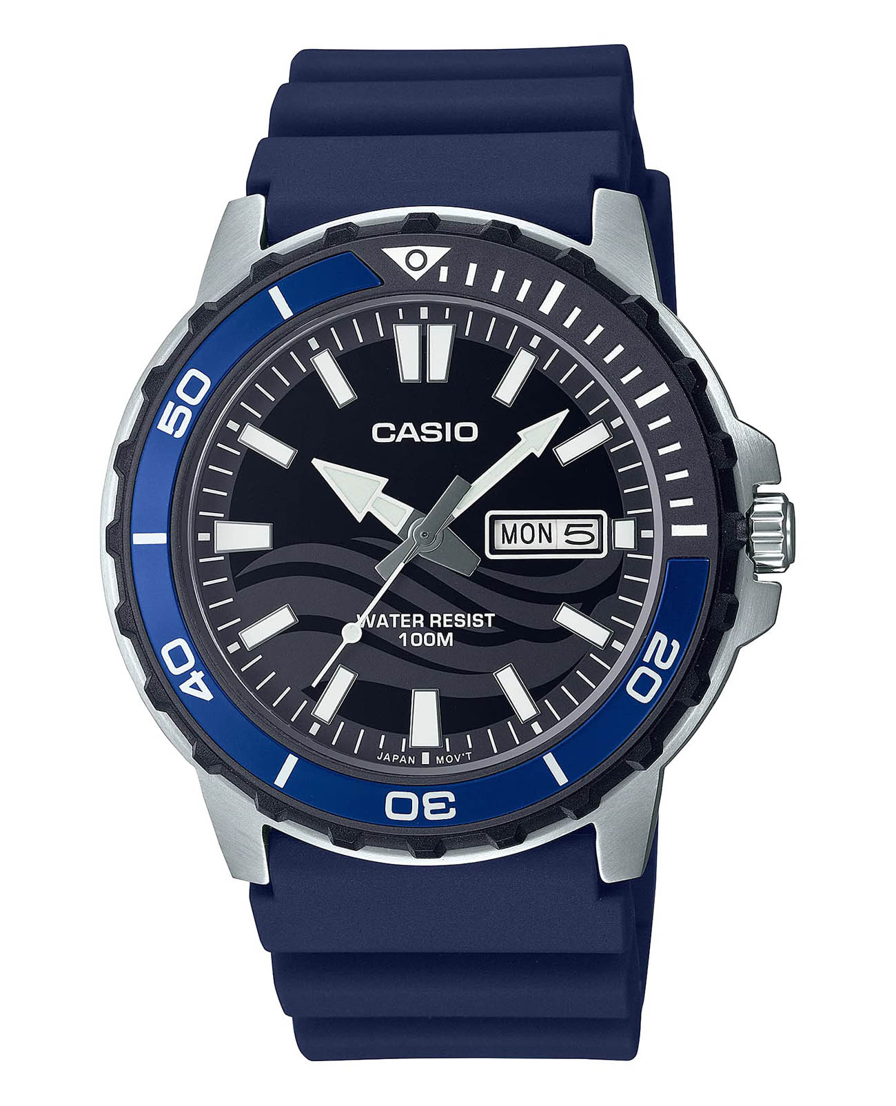 Мужские японские часы Casio MTD-125-2A, кварцевый механизм с высокой точностью. Класс водозащиты: 100 метров. Круглый стальной корпус изготовлен из нержавеющей стали. БезельБезельВнешний ободок, закрепляющий стекло. В спортивных часах так называется поворотное кольцо с делениями на циферблате, выполняет роль таймера – замеряет отрезки времени на шкале. Неподвижный безель – элемент декора. Однонаправленно вращающийся безель на дайверских часах позволяет фиксировать моменты погружения и выныривания на поверхность. c IP-покрытиемIP-покрытиеМетод ионного напыления. Демонстрирует повышенную устойчивость к истиранию, окислению и химическим веществам. Под воздействием высокого давления и температуры около 1500°C молекулы металла надёжно соединяются с частицами корпуса часов. черного цвета. Окошко даты на отметке 3 часа. Рифленая заводная головка. Ремешок из полимерного пластика с классической застежкой.