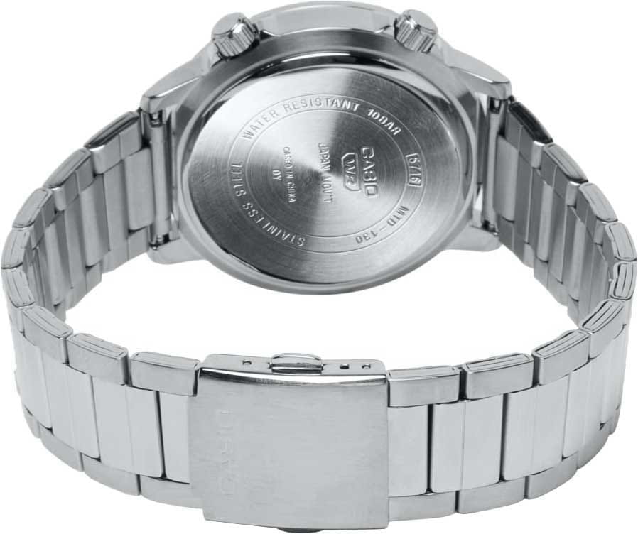 Мужские японские часы Casio MTD-130D-1A4, кварцевый механизм с высокой точностью. Класс водозащиты: 100 метров. Круглый стальной корпус изготовлен из нержавеющей стали. Апертура даты на отметке 4 часа. Браслет из нержавеющей стали с раскладной застежкойРаскладная застёжкаТакой тип застёжки используется только на браслетах из металла. Она никогда не раскрывается полностью, происходит разделение на 2 и более частей. Раскладывающая застёжка снизит вероятность потери часов к минимуму.. Стрелки и метки с люминесцентным покрытиемЛюминесцентное покрытиеПозволяет считывать показания времени в темноте. Производители наносят на стрелки, часовые индексы, безель или поверхность циферблата светонакопительный состав, дающий холодное свечение..