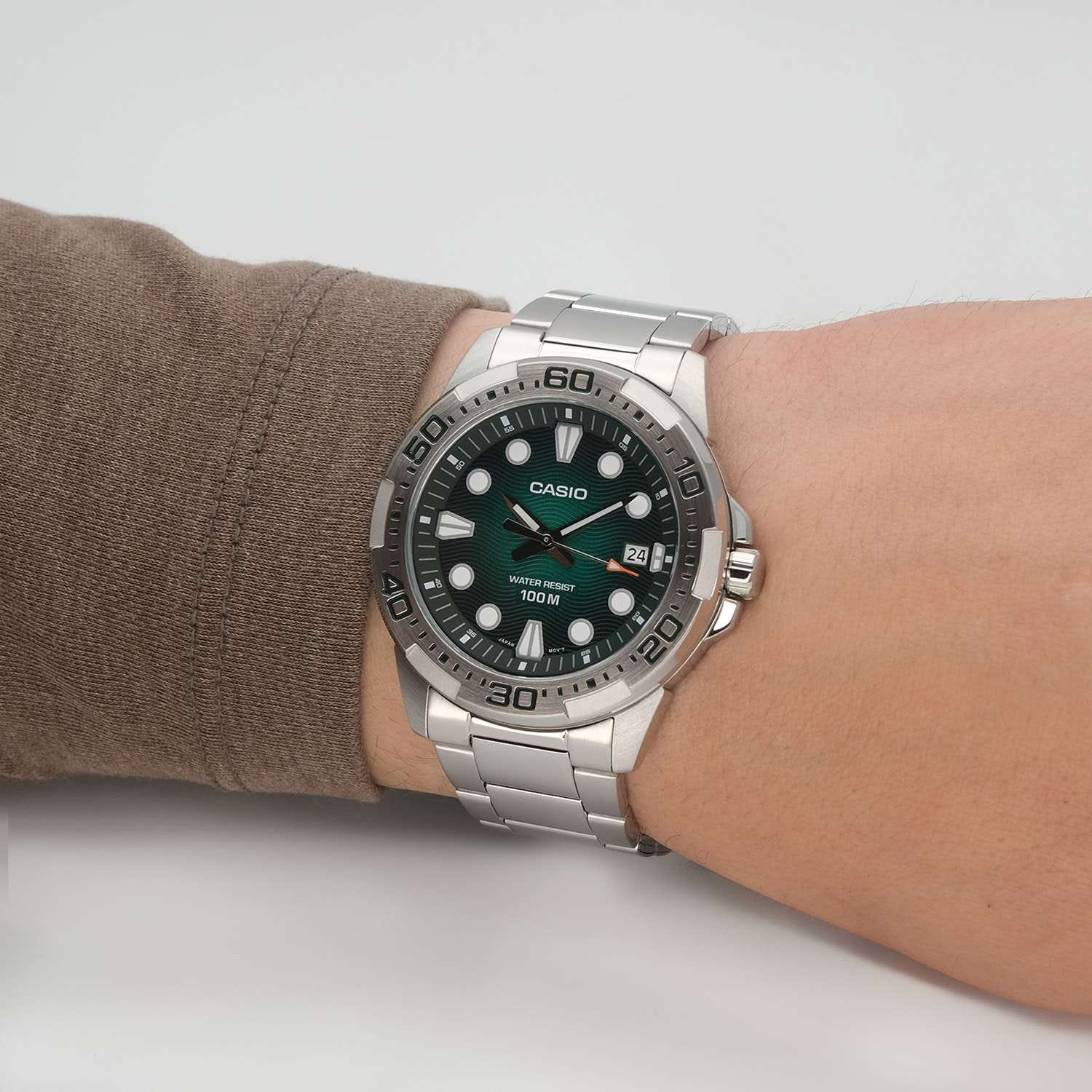 Мужские кварцевые часы Casio MTD-140D-3A — надёжный спортивный аксессуар с японской точностью. Круглый корпус размером 43,7 мм из нержавеющей стали, зелёный циферблат с точками и штрихами, окошко даты в положении 3 часов. Стекло — минеральноеМинеральное стеклоМинеральное стекло представляет собой искусственно выращенный минерал кварца. Такое стекло отличается особой устойчивостью к повреждениям и царапинам. Уступает по некоторым качествам сапфировому стеклу.. Механизм — кварцевый, точность хода ±20 секунд в месяц. Водонепроницаемость 100 м. Заводная головка с защитой. Браслет — стальной на раскладной застёжкеРаскладная застёжкаТакой тип застёжки используется только на браслетах из металла. Она никогда не раскрывается полностью, происходит разделение на 2 и более частей. Раскладывающая застёжка снизит вероятность потери часов к минимуму.. Идеальный выбор для тех, кто ценит японское качество и функциональный повседневный стиль.
