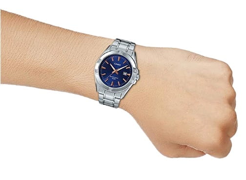 Японские мужские часы с минеральным стекломМинеральное стеклоМинеральное стекло представляет собой искусственно выращенный минерал кварца. Такое стекло отличается особой устойчивостью к повреждениям и царапинам. Уступает по некоторым качествам сапфировому стеклу. Casio MTP-1308D-2A, кварцевый механизм с высокой точностью. Класс водозащиты: 50 метров, позволит защитить корпус от случайных брызг или капель дождя. Корпус часов изготовлен из стали. Стальной браслет на раскладной застёжкеРаскладная застёжкаТакой тип застёжки используется только на браслетах из металла. Она никогда не раскрывается полностью, происходит разделение на 2 и более частей. Раскладывающая застёжка снизит вероятность потери часов к минимуму.. Стрелки с люминесцентным покрытиемЛюминесцентное покрытиеПозволяет считывать показания времени в темноте. Производители наносят на стрелки, часовые индексы, безель или поверхность циферблата светонакопительный состав, дающий холодное свечение.. Окошко даты находится в положении 3 часа. Заводная головка с защитой.