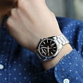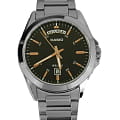 Японские мужские наручные часы с минеральным стекломМинеральное стеклоМинеральное стекло представляет собой искусственно выращенный минерал кварца. Такое стекло отличается особой устойчивостью к повреждениям и царапинам. Уступает по некоторым качествам сапфировому стеклу. Casio MTP-1370D-1A2, кварцевый механизм с высокой точностью. Класс водозащиты: 50 метров, позволит защитить корпус от случайных брызг или капель дождя. Корпус часов изготовлен из латуни. Стальной браслет на раскладной застёжке. Окошко даты находится в положении 6 часов. Заводная головка с защитой. Стрелки с люминесцентным покрытиемЛюминесцентное покрытиеПозволяет считывать показания времени в темноте. Производители наносят на стрелки, часовые индексы, безель или поверхность циферблата светонакопительный состав, дающий холодное свечение..