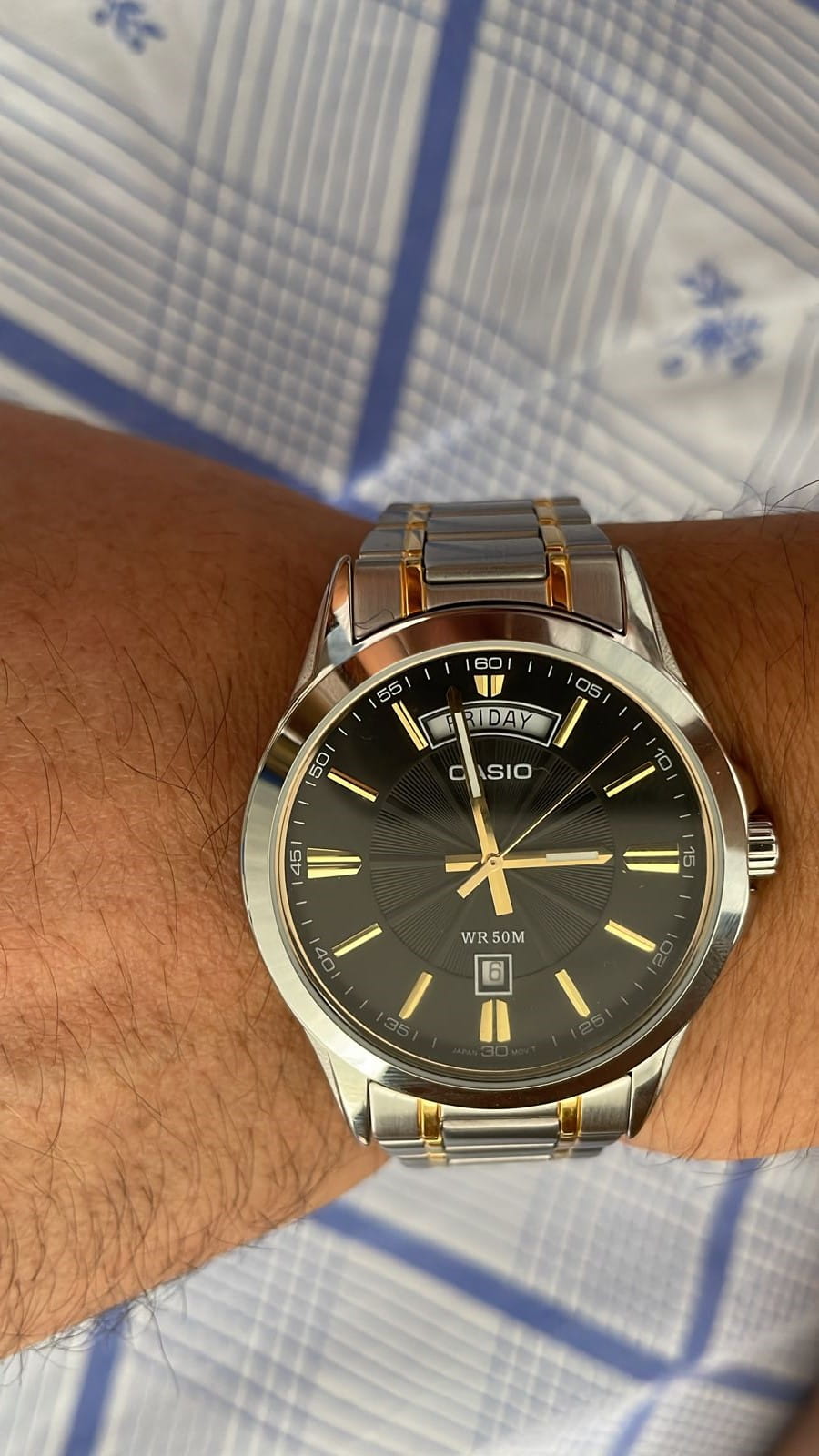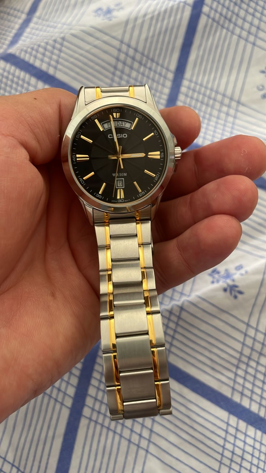 Японские мужские наручные часы с минеральным стекломМинеральное стеклоМинеральное стекло представляет собой искусственно выращенный минерал кварца. Такое стекло отличается особой устойчивостью к повреждениям и царапинам. Уступает по некоторым качествам сапфировому стеклу. Casio MTP-1381G-1A, кварцевый механизм с высокой точностью. Класс водозащиты: 50 метров, позволит защитить корпус от случайных брызг или капель дождя. Корпус часов изготовлен из стали. Стальной браслет на раскладной застёжкеРаскладная застёжкаТакой тип застёжки используется только на браслетах из металла. Она никогда не раскрывается полностью, происходит разделение на 2 и более частей. Раскладывающая застёжка снизит вероятность потери часов к минимуму. с IP-покрытиемIP-покрытиеМетод ионного напыления. Демонстрирует повышенную устойчивость к истиранию, окислению и химическим веществам. Под воздействием высокого давления и температуры около 1500°C молекулы металла надёжно соединяются с частицами корпуса часов.. Окошко даты находится в положении 6 часов.
