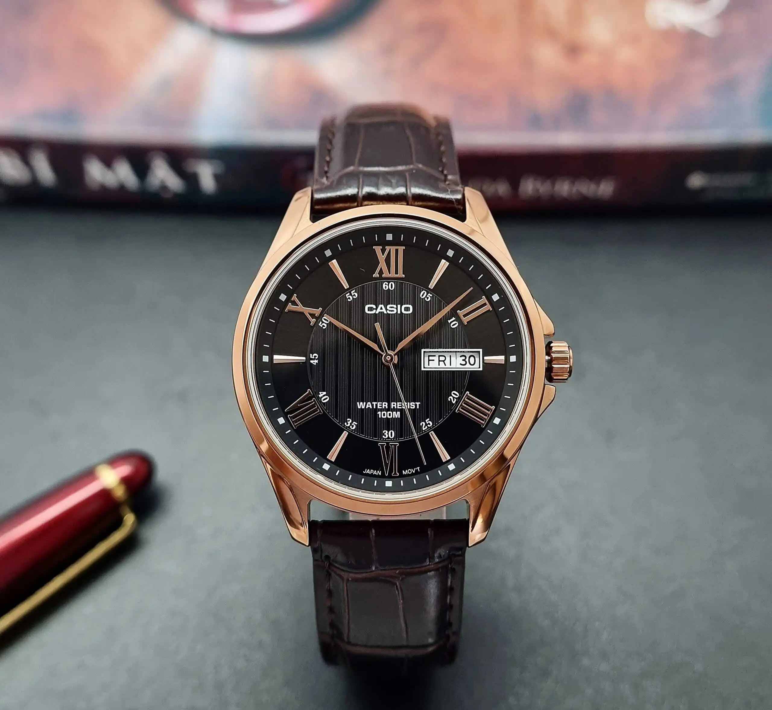 Японские мужские наручные часы с минеральным стекломМинеральное стеклоМинеральное стекло представляет собой искусственно выращенный минерал кварца. Такое стекло отличается особой устойчивостью к повреждениям и царапинам. Уступает по некоторым качествам сапфировому стеклу. Casio Collection MTP-1384L-1A, кварцевый механизм с высокой точностью. Класс водозащиты: 100 метров, позволит плавать, нырять и заниматься другими водными видами спорта. Корпус часов изготовлен из стали с IP-покрытиемIP-покрытиеМетод ионного напыления. Демонстрирует повышенную устойчивость к истиранию, окислению и химическим веществам. Под воздействием высокого давления и температуры около 1500°C молекулы металла надёжно соединяются с частицами корпуса часов.. Кожаный ремешок на стандартной застёжке. Окошки дня недели и даты находятся в положении 3 часа. Заводная головка с защитой. Задняя крышка с винтовым фиксатором.