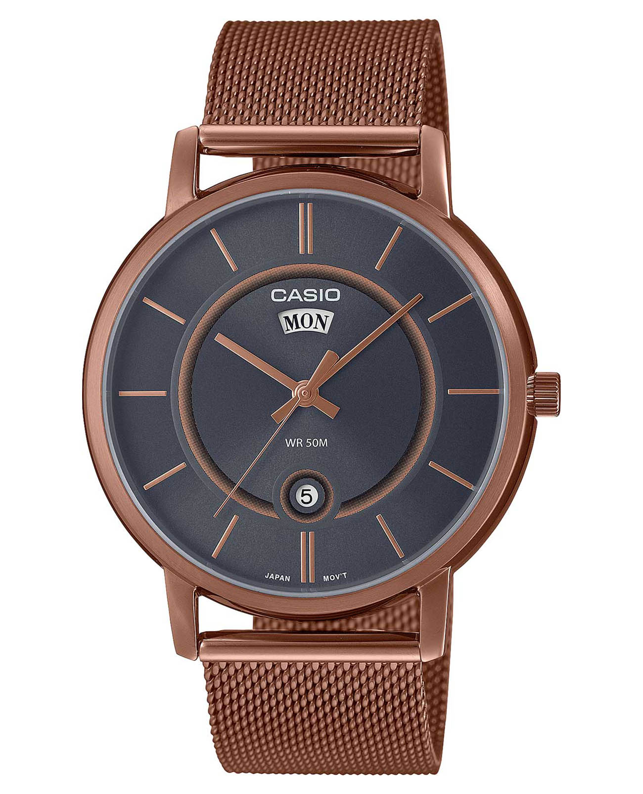 Японские мужские наручные часы Casio Collection MTP-B120MR-8A с минеральным стекломМинеральное стеклоМинеральное стекло представляет собой искусственно выращенный минерал кварца. Такое стекло отличается особой устойчивостью к повреждениям и царапинам. Уступает по некоторым качествам сапфировому стеклу., кварцевый механизм с высокой точностью. Класс водозащиты: 50 метров, позволит защитить корпус от случайных брызг или капель дождя. Корпус часов изготовлен из стали с IP-покрытиемIP-покрытиеМетод ионного напыления. Демонстрирует повышенную устойчивость к истиранию, окислению и химическим веществам. Под воздействием высокого давления и температуры около 1500°C молекулы металла надёжно соединяются с частицами корпуса часов..Стальной браслет миланского плетения с IP-покрытиемIP-покрытиеМетод ионного напыления. Демонстрирует повышенную устойчивость к истиранию, окислению и химическим веществам. Под воздействием высокого давления и температуры около 1500°C молекулы металла надёжно соединяются с частицами корпуса часов. на раскладном замкеРаскладной замокДанный вариант застежки используется только на часах с металлическим браслетом. Отличительная особенность такого крепления в том, что длина браслета становится универсальной и вы можете самостоятельно отрегулировать нужный вам размер – застежка просто двигается по браслету часов.. Указатель даты находится в положении 6 часов. Указатель дня недели находится в положении 12 часов. Батарея рассчитана на 3 года. Циферблат с метками в виде штрихов.