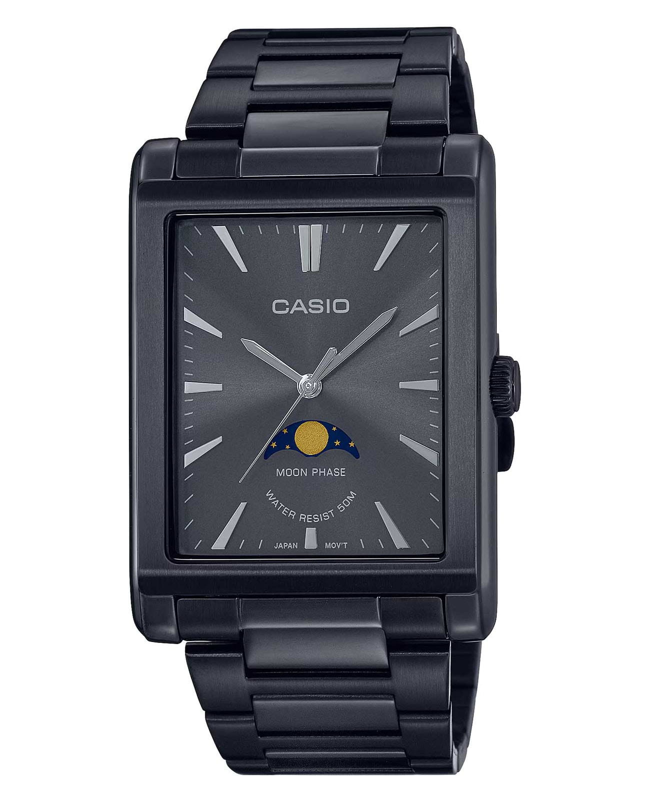 Японские мужские часы с минеральным стекломМинеральное стеклоМинеральное стекло представляет собой искусственно выращенный минерал кварца. Такое стекло отличается особой устойчивостью к повреждениям и царапинам. Уступает по некоторым качествам сапфировому стеклу. Casio Collection MTP-M105B-1A, кварцевый механизм с высокой точностью. Корпус часов изготовлен из стали с IP-покрытиемIP-покрытиеМетод ионного напыления. Демонстрирует повышенную устойчивость к истиранию, окислению и химическим веществам. Под воздействием высокого давления и температуры около 1500°C молекулы металла надёжно соединяются с частицами корпуса часов.. Циферблат с метками в виде штрихов выполнен по технологии Sunray (солнечные лучи). Отображение фаз Луны. Заводная головка с защитой. Батарейка рассчитана на 3 года. Задняя крышка с винтовым фиксатором. Класс водозащиты: 50 метров, позволит защитить корпус от случайных брызг или капель дождя. Стальной браслет с IP-покрытиемIP-покрытиеМетод ионного напыления. Демонстрирует повышенную устойчивость к истиранию, окислению и химическим веществам. Под воздействием высокого давления и температуры около 1500°C молекулы металла надёжно соединяются с частицами корпуса часов. на раскладной застёжкеРаскладная застёжкаТакой тип застёжки используется только на браслетах из металла. Она никогда не раскрывается полностью, происходит разделение на 2 и более частей. Раскладывающая застёжка снизит вероятность потери часов к минимуму..