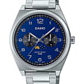 Японские мужские часы Casio Classic MTP-M300D-2A с минеральным стекломМинеральное стеклоМинеральное стекло представляет собой искусственно выращенный минерал кварца. Такое стекло отличается особой устойчивостью к повреждениям и царапинам. Уступает по некоторым качествам сапфировому стеклу., устойчивым к мелким механическим повреждениям. Корпус часов изготовлен из нержавеющей стали. Стрелки с люминесцентным покрытиемЛюминесцентное покрытиеПозволяет считывать показания времени в темноте. Производители наносят на стрелки, часовые индексы, безель или поверхность циферблата светонакопительный состав, дающий холодное свечение.. Класс водозащиты: 50 метров, позволит защитить корпус от случайных брызг или капель дождя. Особенностью модели является наличие индикатора фазы луны над шестью часами по циферблату. Индикатор имеет 4 положения и отображается новолуние и полнолуние, а также растущую и убывающую Луну. Стальной браслет на раскладной застёжкеРаскладная застёжкаТакой тип застёжки используется только на браслетах из металла. Она никогда не раскрывается полностью, происходит разделение на 2 и более частей. Раскладывающая застёжка снизит вероятность потери часов к минимуму..