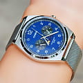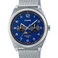Японские мужские кварцевые часы с минеральным стекломМинеральное стеклоМинеральное стекло представляет собой искусственно выращенный минерал кварца. Такое стекло отличается особой устойчивостью к повреждениям и царапинам. Уступает по некоторым качествам сапфировому стеклу. Casio Collection MTP-M300M-2A, кварцевый механизм с высокой точностью. Корпус часов изготовлен из нержавеющей стали. Циферблат с метками в виде штрихов. Стрелки с люминесцентным покрытиемЛюминесцентное покрытиеПозволяет считывать показания времени в темноте. Производители наносят на стрелки, часовые индексы, безель или поверхность циферблата светонакопительный состав, дающий холодное свечение.. Особенностью модели является наличие индикатора фазы луны над шестью часами по циферблату. Индикатор имеет 4 положения и отображается новолуние и полнолуние, а также растущую и убывающую Луну. Батарейка рассчитана на 3 года. Класс водозащиты: 50 метров, позволит защитить корпус от случайных брызг или капель дождя. Стальной браслет миланского плетения на раскладном замкеРаскладной замокДанный вариант застежки используется только на часах с металлическим браслетом. Отличительная особенность такого крепления в том, что длина браслета становится универсальной и вы можете самостоятельно отрегулировать нужный вам размер – застежка просто двигается по браслету часов..