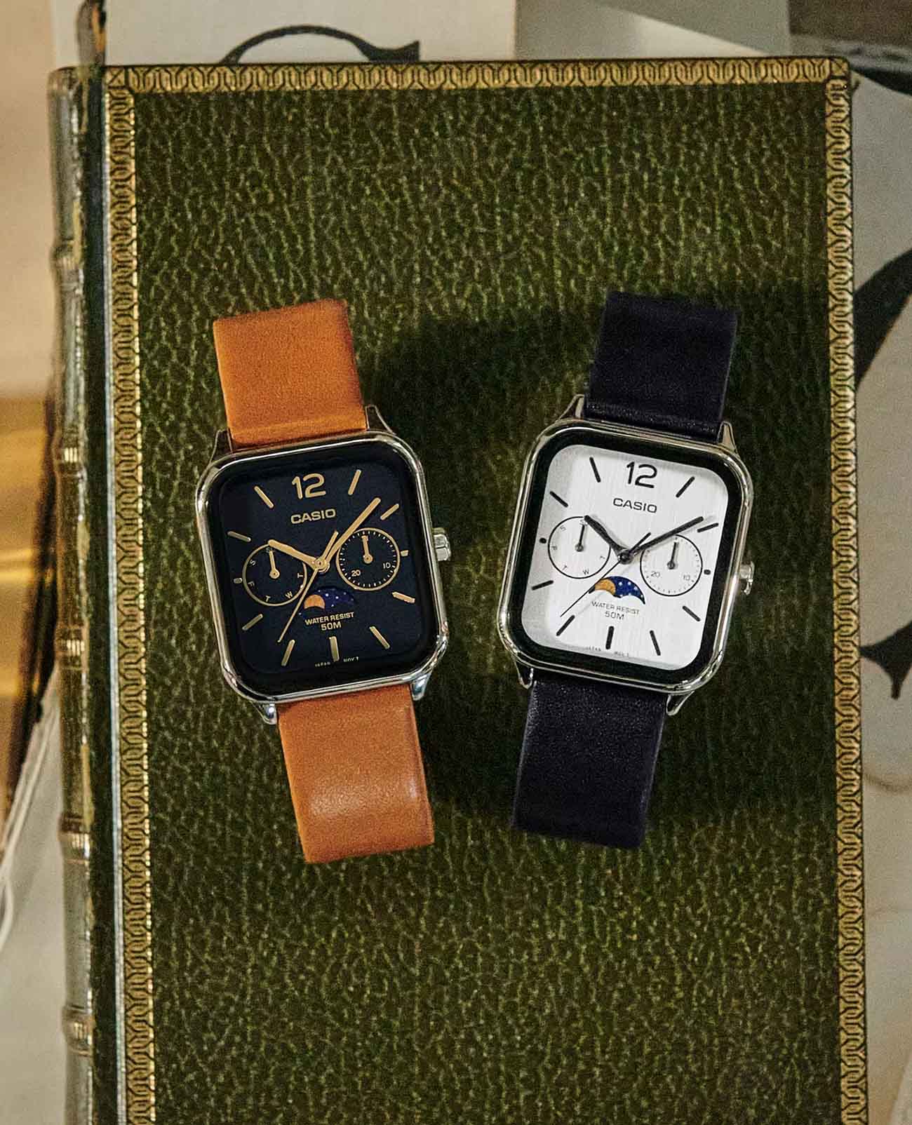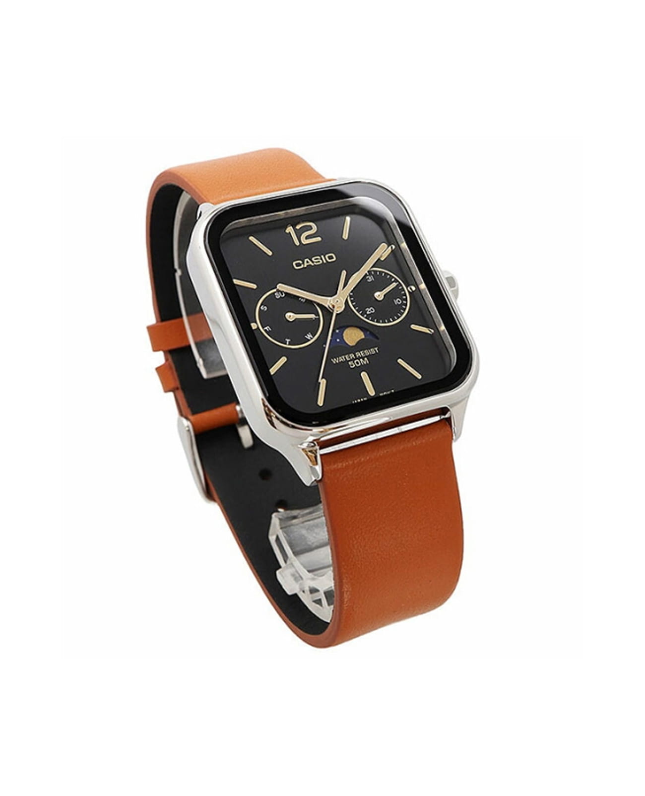 Японские мужские кварцевые часы с минеральным стекломМинеральное стеклоМинеральное стекло представляет собой искусственно выращенный минерал кварца. Такое стекло отличается особой устойчивостью к повреждениям и царапинам. Уступает по некоторым качествам сапфировому стеклу. Casio Collection MTP-M305L-1A, кварцевый механизм с высокой точностью. Корпус часов изготовлен из нержавеющей стали. Циферблат с метками в виде штрихов. Особенностью модели является наличие индикатора фазы луны над шестью часами по циферблату. Индикатор имеет 4 положения и отображается новолуние и полнолуние, а также растущую и убывающую Луну. Батарейка рассчитана на 3 года. Класс водозащиты: 50 метров, позволит защитить корпус от случайных брызг или капель дождя. Кожаный ремешок на стандартной застежке.