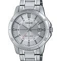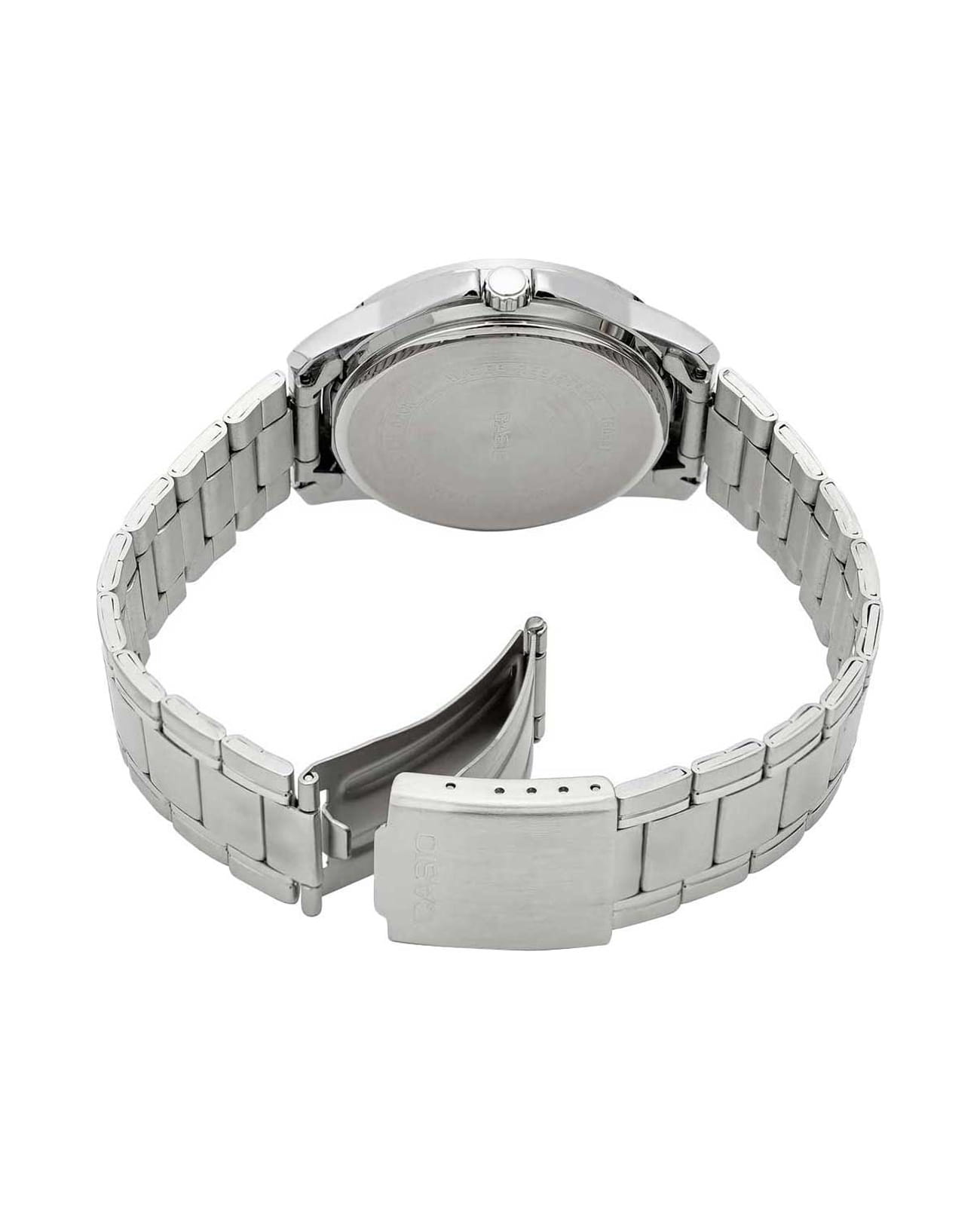 Японские мужские кварцевые часы с минеральным стекломМинеральное стеклоМинеральное стекло представляет собой искусственно выращенный минерал кварца. Такое стекло отличается особой устойчивостью к повреждениям и царапинам. Уступает по некоторым качествам сапфировому стеклу. Casio Collection MTP-V004D-7C, кварцевый механизм с высокой точностью. Корпус и браслет часов изготовлен из нержавеющей стали. Циферблат с метками в виде штрихов выполнен по технологии Sunray (солнечные лучи). Окошко даты находится в положении 3 часа. Класс водозащиты: 30 метров, позволит защитить корпус от случайных брызг или капель дождя. Стальной браслет на раскладной застёжкеРаскладная застёжкаТакой тип застёжки используется только на браслетах из металла. Она никогда не раскрывается полностью, происходит разделение на 2 и более частей. Раскладывающая застёжка снизит вероятность потери часов к минимуму..