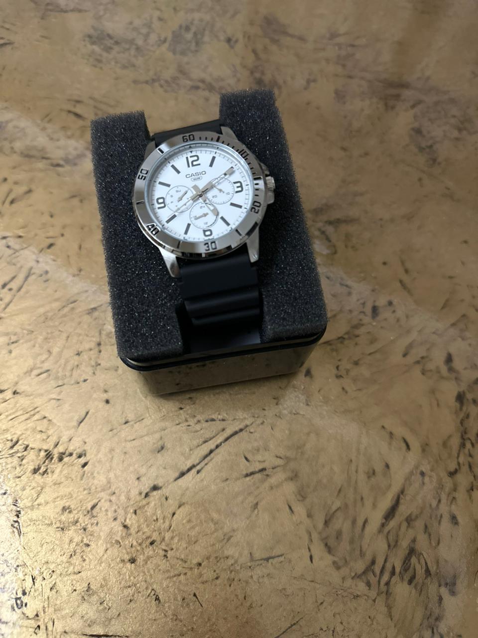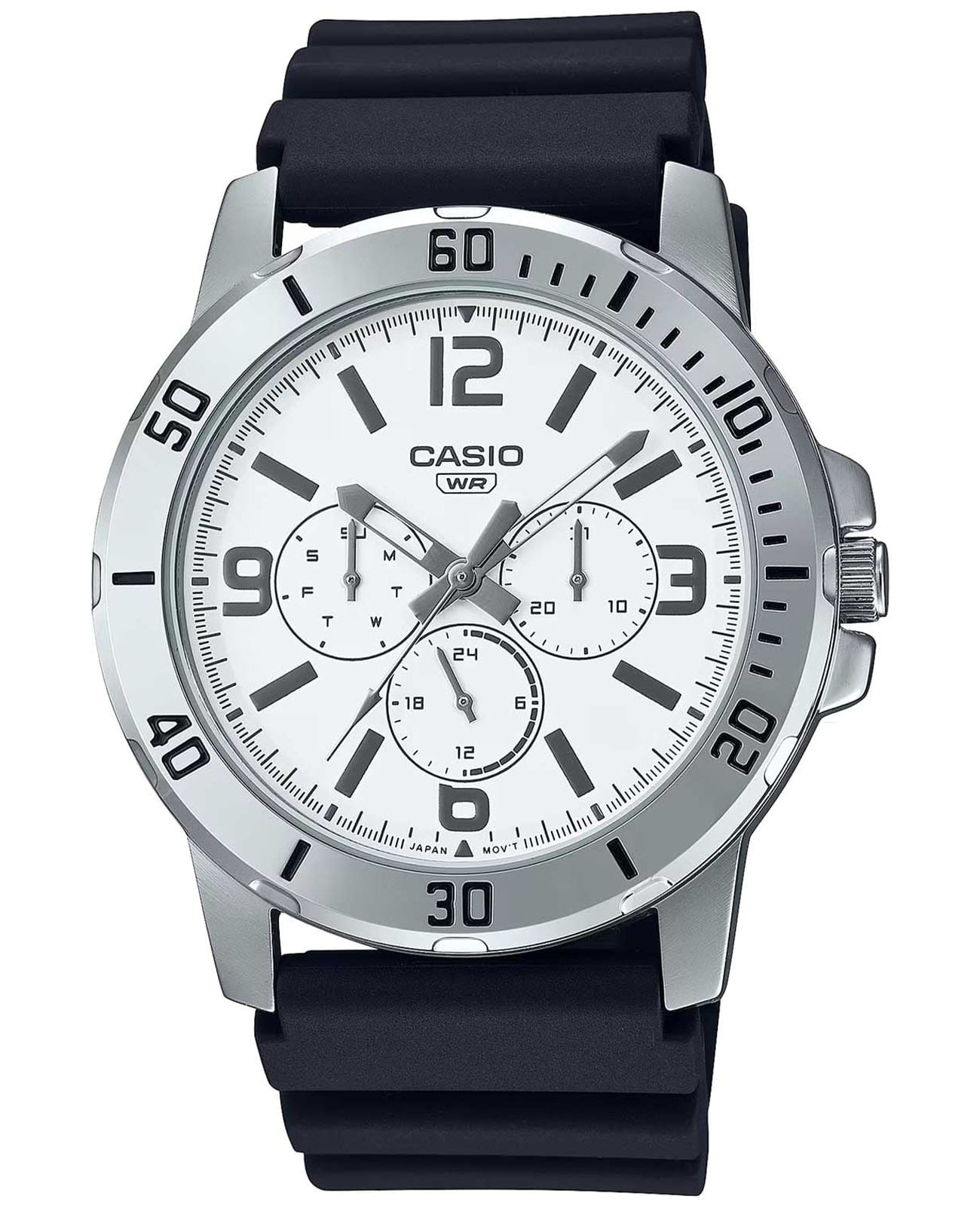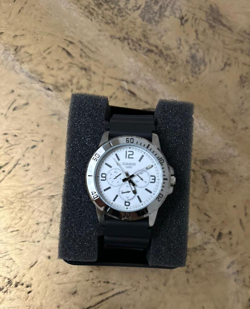 Японские мужские наручные часы с минеральным стекломМинеральное стеклоМинеральное стекло представляет собой искусственно выращенный минерал кварца. Такое стекло отличается особой устойчивостью к повреждениям и царапинам. Уступает по некоторым качествам сапфировому стеклу. Casio Collection MTP-VD300-7B, кварцевый механизм с высокой точностью. Аксессуар в классическом серебристом исполнении корпуса, с черным ремешком никогда не утратит актуальности, он будет прекрасным дополнением к классическому костюму, спортивной футболке, модных джинсах. Компактный циферблат выполнен в минималистичном стиле. Метки в виде штрихов и арабских цифр. 12-ти и 24-х часовой формат времени, число и день недели вынесены на отдельные циферблаты. Заводная головка с защитой. Батарея рассчитана на 3 года. Класс водозащиты: 50 метров, позволит защитить корпус от случайных брызг или капель дождя. Кожаный ремешок на стандартной застежке.