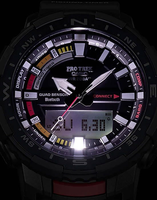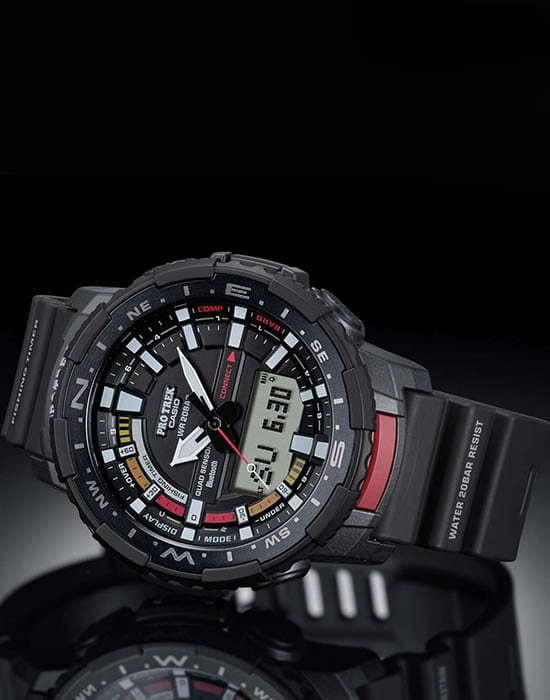 -навигация. Японский кварцевый механизм получает питание от батарейки, рассчитанной на 2-летний срок службы. Устойчивость к температуре ниже -10°C. Степень водостойкости WR 200. Ударопрочный корпусУдаропрочный корпусМеханизм заключён в корпус, выполненный из современных материалов, устойчивых к ударам, механическим повреждениям и падению с высоты: инновационный пластик, карбон, нержавеющая сталь, титан.. Минеральное стекло. Электролюминесцентная подсветкаЭлектролюминесцентная подсветкаЭлектролюминесцентная панель устанавливается под ЖК-экраном часов, при нажатии кнопки электричество преобразуется в свет за счёт подачи напряжения на атомы фосфора, такой тип подсветки позволяет освещать весь циферблат.. Полимерный ремешок с 3D-текстурой и системой быстрой замены браслета. Габариты: 57,5 x 50,8 x 16,8 мм.