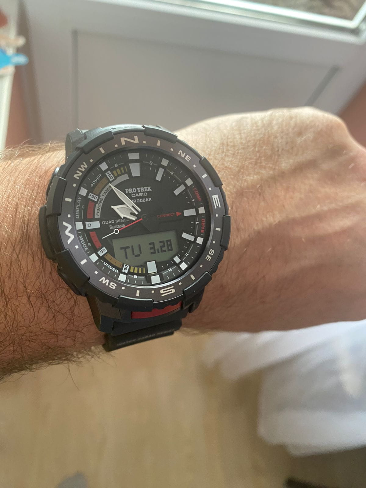 Модель в спортивном стиле имеет внушительный поворотный безельБезельВнешний ободок, закрепляющий стекло. В спортивных часах так называется поворотное кольцо с делениями на циферблате, выполняет роль таймера – замеряет отрезки времени на шкале. Неподвижный безель – элемент декора. Однонаправленно вращающийся безель на дайверских часах позволяет фиксировать моменты погружения и выныривания на поверхность. и узнаваемые угловатые детали. Расширенный список дополнительных возможностей делает часы отличным вариантом для путешествий. Функции: шагомер (от 0 до 999999 шагов), высотомер, барометр, будильник, хронографХронографФункция позволяет измерять отрезки времени с особой точностью: часы, минуты, секунды. Верным признаком хронографа является наличие на циферблате 3 дополнительных окошек-счётчиков., график восхода и заката солнца, цифровой компас, Bluetooth® SmartBluetoothСовременная технология, позволяющая синхронизировать часы с телефоном и переносить данные. Часы с Bluetooth расширяют возможности вашего смартфона и делают его использование ещё более удобным., поиск телефона, мировое времяМировое время Полезное часовое усложнение, отображающее время в основных городах и известных областях по всему миру, оно связано с часовыми поясами, удобно для путешественников и бизнесменов. – 38 часовых поясов, высокочувствительный термометр -10°C /+60°C, GPSGPSСистема спутниковой навигации. Часы оснащены приёмником GPS-сигнала, который получает необходимую информацию по GSM, GPRS, со спутников. Принимая сигнал, наручные часы могут установить точные показатели времени и даты, часовой пояс, сообщить местоположение своего владельца.