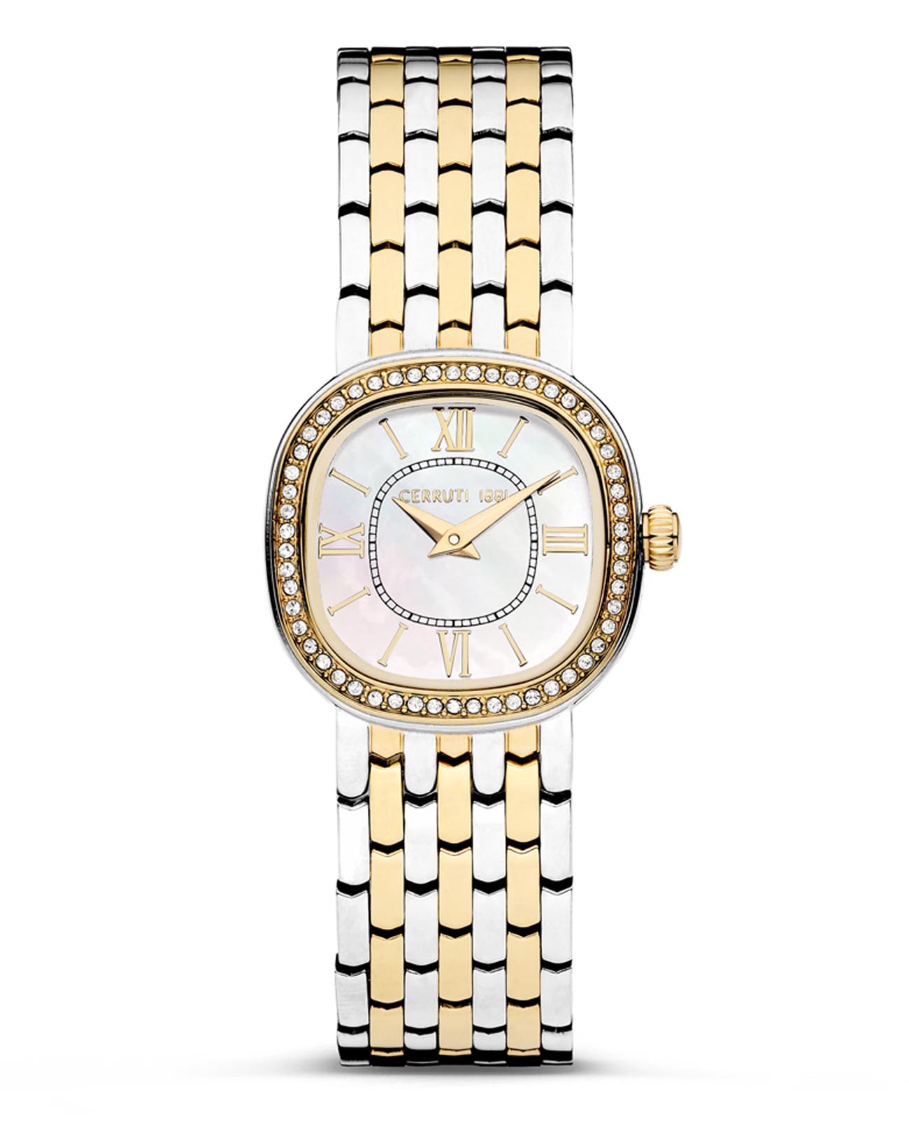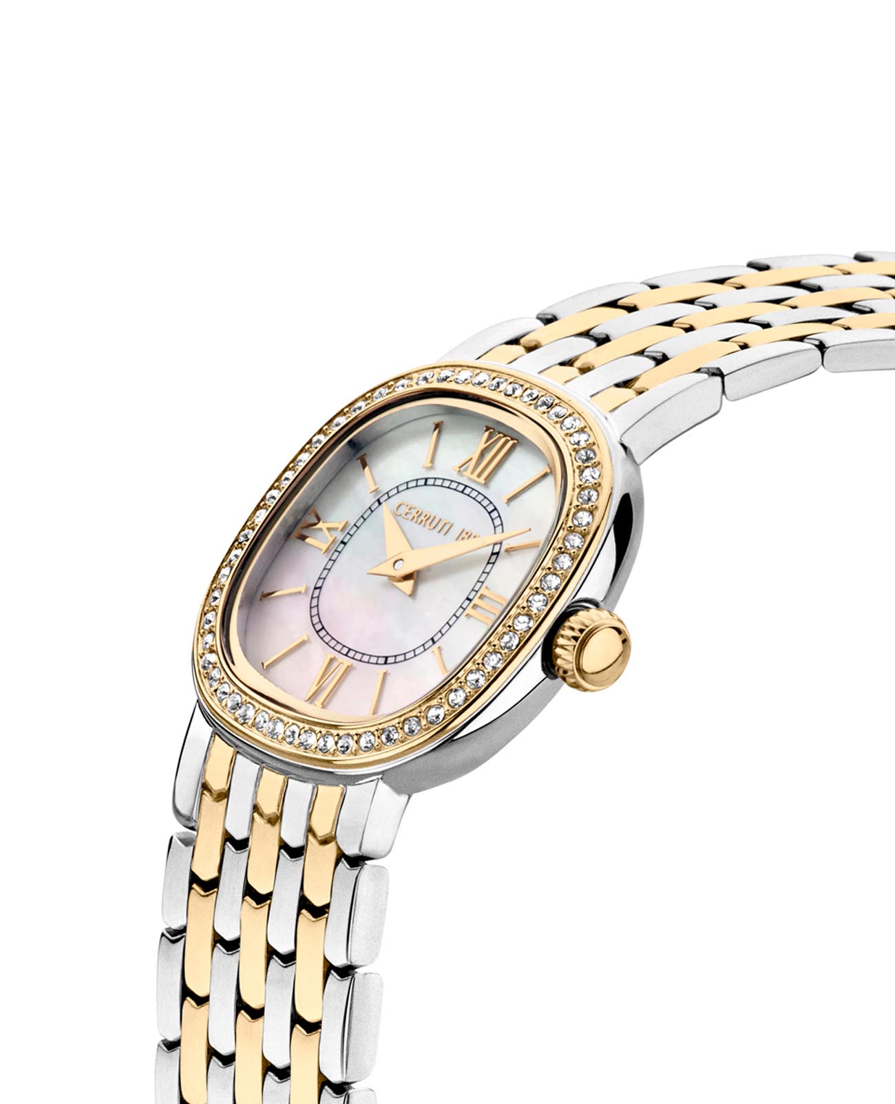 Французские женские часы с кристаллами Cerruti 1881 Gresta CIWLG0008604, кварцевый механизм с высокой точностью. Минеральное стеклоМинеральное стеклоМинеральное стекло представляет собой искусственно выращенный минерал кварца. Такое стекло отличается особой устойчивостью к повреждениям и царапинам. Уступает по некоторым качествам сапфировому стеклу. устойчивое к мелким механическим повреждениям. Корпус часов изготовлен из стали. БезельБезельВнешний ободок, закрепляющий стекло. В спортивных часах так называется поворотное кольцо с делениями на циферблате, выполняет роль таймера – замеряет отрезки времени на шкале. Неподвижный безель – элемент декора. Однонаправленно вращающийся безель на дайверских часах позволяет фиксировать моменты погружения и выныривания на поверхность. с IP-покрытиемIP-покрытиеМетод ионного напыления. Демонстрирует повышенную устойчивость к истиранию, окислению и химическим веществам. Под воздействием высокого давления и температуры около 1500°C молекулы металла надёжно соединяются с частицами корпуса часов. украшен кристаллами. Циферблат модели выполнен с метками в виде римских цифр. Класс водозащиты: 30 метров, позволит защитить корпус от случайных брызг или капель дождя. Стальной браслет с частичным IP-покрытиемIP-покрытиеМетод ионного напыления. Демонстрирует повышенную устойчивость к истиранию, окислению и химическим веществам. Под воздействием высокого давления и температуры около 1500°C молекулы металла надёжно соединяются с частицами корпуса часов. на застёжка «бабочка» с кнопкамиЗастёжка "бабочка"Такой вид застёжки дополняется предохранителями, помогающими избежать случайного раскрытия браслета. Обладают изящным исполнением. .