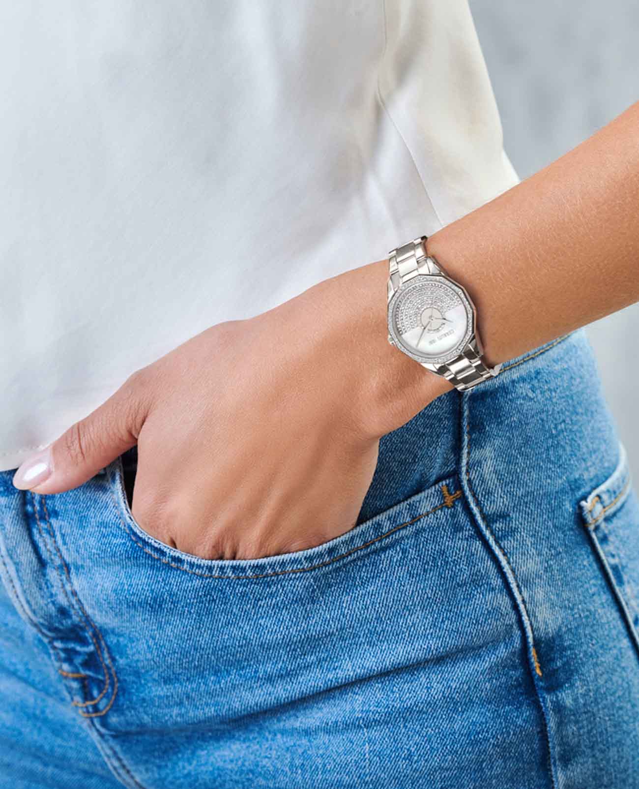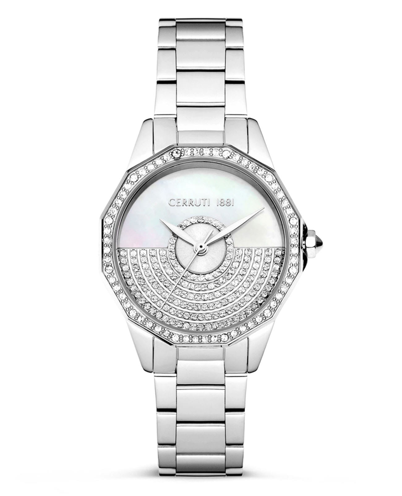 Французские женские часы с кристаллами Cerruti 1881 Jesina CIWLG0008901, кварцевый механизм с высокой точностью. Минеральное стеклоМинеральное стеклоМинеральное стекло представляет собой искусственно выращенный минерал кварца. Такое стекло отличается особой устойчивостью к повреждениям и царапинам. Уступает по некоторым качествам сапфировому стеклу. устойчивое к мелким механическим повреждениям. Корпус часов изготовлен из стали. БезельБезельВнешний ободок, закрепляющий стекло. В спортивных часах так называется поворотное кольцо с делениями на циферблате, выполняет роль таймера – замеряет отрезки времени на шкале. Неподвижный безель – элемент декора. Однонаправленно вращающийся безель на дайверских часах позволяет фиксировать моменты погружения и выныривания на поверхность. и циферблат украшены кристаллами. Класс водозащиты: 30 метров, позволит защитить корпус от случайных брызг или капель дождя. Стальной браслет на застёжке-бабочке с кнопкамиЗастёжка "бабочка"Такой вид застёжки дополняется предохранителями, помогающими избежать случайного раскрытия браслета. Обладают изящным исполнением. .