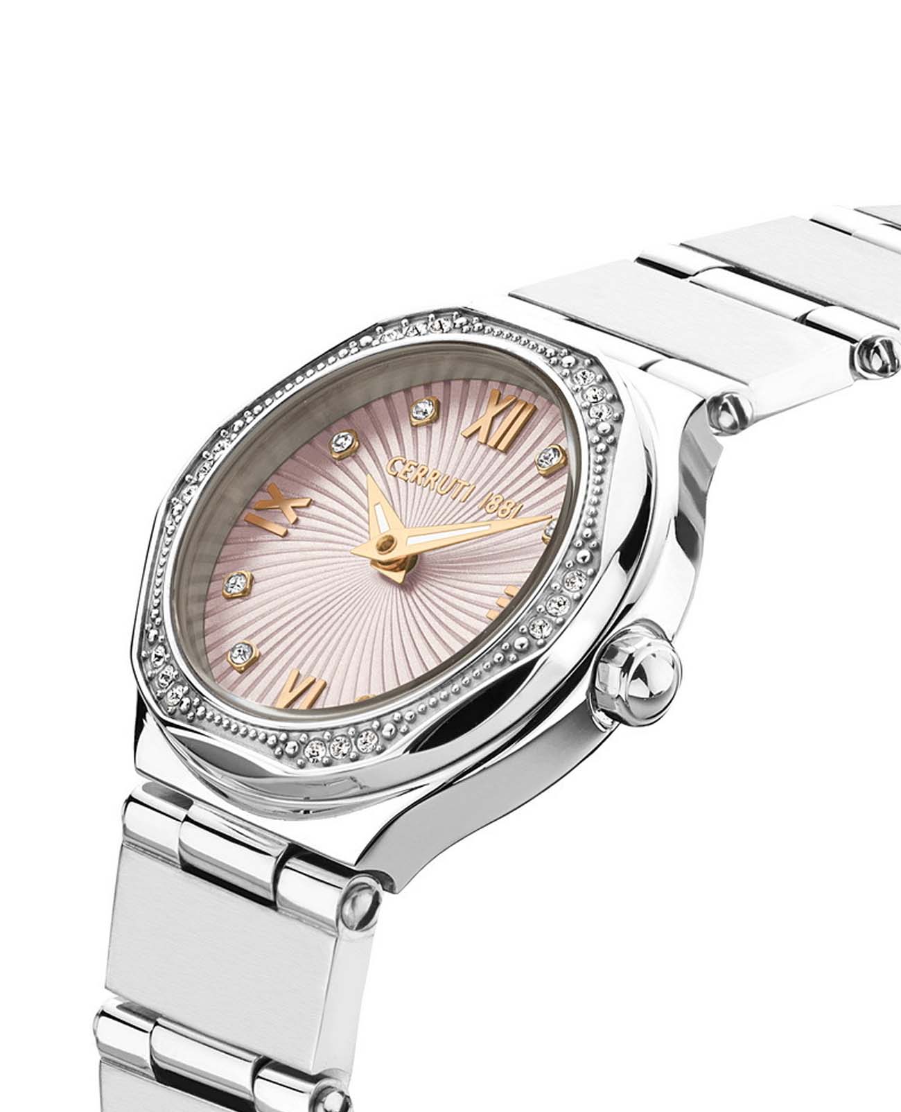 Французские женские часы с кристаллами Cerruti 1881 Rendinara CIWLH2225303, кварцевый механизм с высокой точностью. Минеральное стеклоМинеральное стеклоМинеральное стекло представляет собой искусственно выращенный минерал кварца. Такое стекло отличается особой устойчивостью к повреждениям и царапинам. Уступает по некоторым качествам сапфировому стеклу. устойчивое к мелким механическим повреждениям. Корпус часов изготовлен из стали. БезельБезельВнешний ободок, закрепляющий стекло. В спортивных часах так называется поворотное кольцо с делениями на циферблате, выполняет роль таймера – замеряет отрезки времени на шкале. Неподвижный безель – элемент декора. Однонаправленно вращающийся безель на дайверских часах позволяет фиксировать моменты погружения и выныривания на поверхность. с IP-покрытиемIP-покрытиеМетод ионного напыления. Демонстрирует повышенную устойчивость к истиранию, окислению и химическим веществам. Под воздействием высокого давления и температуры около 1500°C молекулы металла надёжно соединяются с частицами корпуса часов. и циферблат украшены кристаллами. Стрелки с люминесцентным покрытиемЛюминесцентное покрытиеПозволяет считывать показания времени в темноте. Производители наносят на стрелки, часовые индексы, безель или поверхность циферблата светонакопительный состав, дающий холодное свечение.. Класс водозащиты: 50 метров, позволит защитить корпус от случайных брызг или капель дождя. Стальной браслет с частичным IP-покрытиемIP-покрытиеМетод ионного напыления. Демонстрирует повышенную устойчивость к истиранию, окислению и химическим веществам. Под воздействием высокого давления и температуры около 1500°C молекулы металла надёжно соединяются с частицами корпуса часов. на застёжке-бабочке с кнопкамиЗастёжка "бабочка"Такой вид застёжки дополняется предохранителями, помогающими избежать случайного раскрытия браслета. Обладают изящным исполнением. .