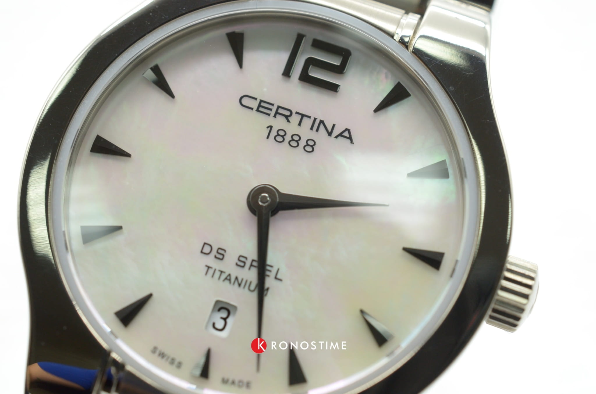 С виду женственная модель внутри – крепкий орешек. Корпус с концепцией DSDS ConceptDouble Security Concept, обозначает двойную надёжность и безупречную точность часов Certina. Двойная система защиты подразумевает обеспечение максимальной устойчивости к ударам и высоких показателей водонепроницаемости. выполнен из прочного гипоаллергенного титана. Перламутровый циферблат защищён сапфировым стеклом. Водозащита WR 100. Отображение числа.