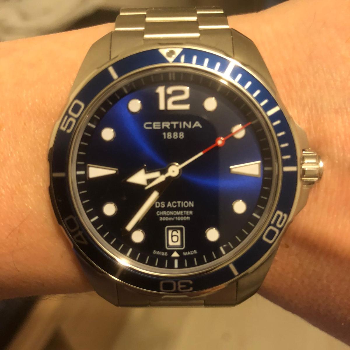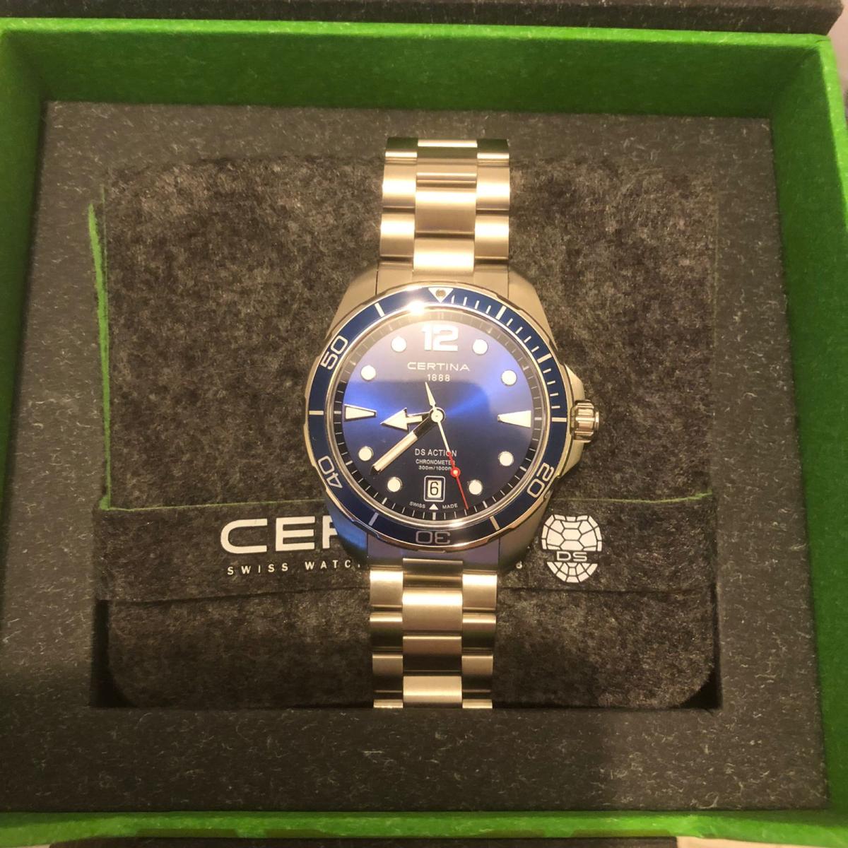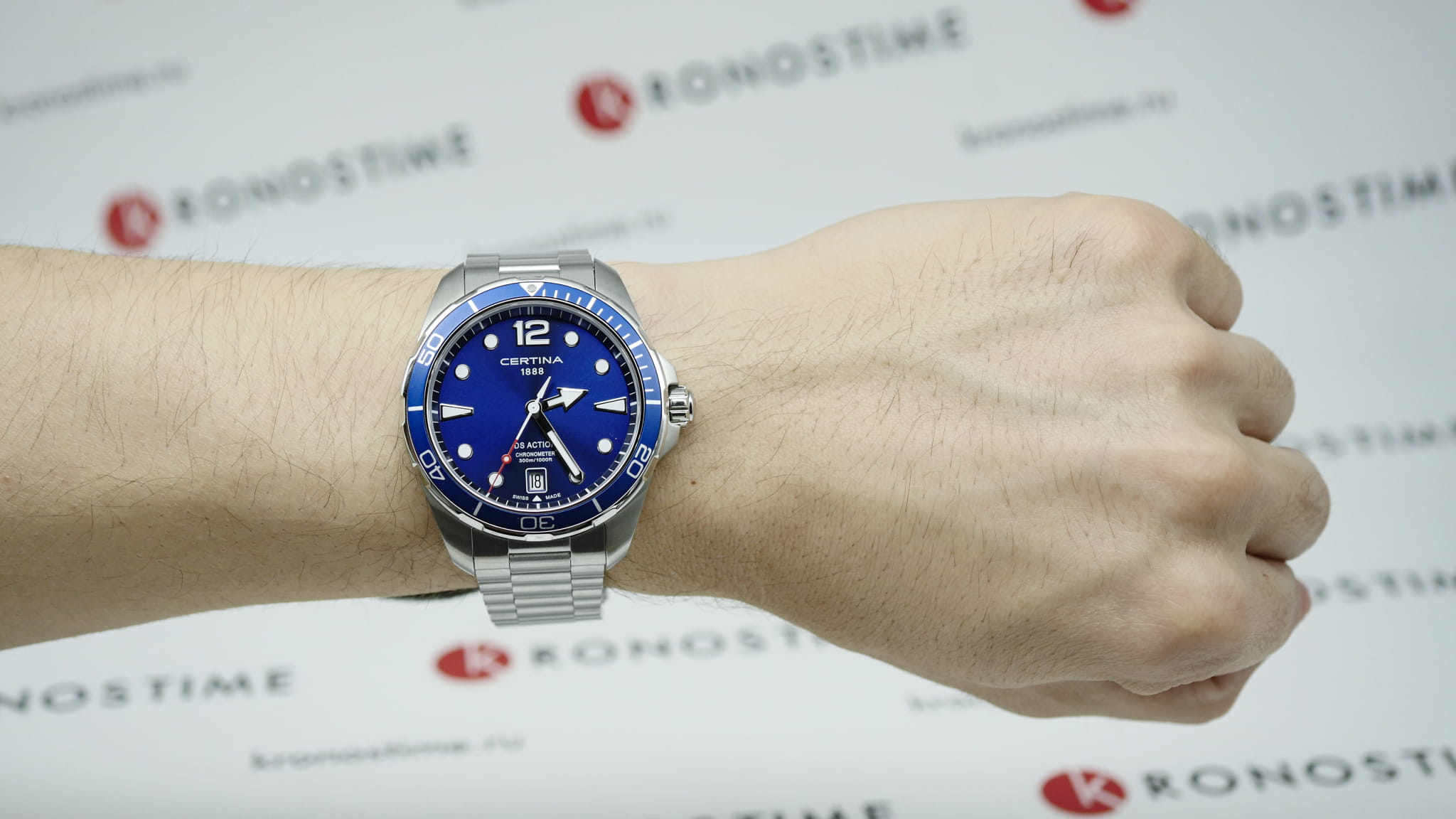 Брендовый аксессуар с насыщенно-синим циферблатом - идеальное дополнение как к деловому, так и к повседневному стилю. Модель отличается предельной точностью швейцарского кварцевого механизма ETA F07.412 Precidrive™Precidrive™Инновационный кварцевый механизм Certina. Часы, оснащённые этим швейцарским калибром, приравниваются к точности к сертифицированным хронометрам, точность хода составляет +/-10 секунд в год., что подтверждается официальным сертификатом COSCСертификат COSCОфициальный сертификат, подтверждающий то, что часы ходят с особо высокой точностью. Для получения документа часы подвергаются тестовым испытаниям, разработанным швейцарским институтом тестирования хронометров COSC. Допустимая норма для механических часов -4/+6 секунд в день, для кварцевых моделей +/- 0,07 секунд в день.. Высокое качество проявляет себя невооружённым глазом: стальной ударопрочный корпусУдаропрочный корпусМеханизм заключён в корпус, выполненный из современных материалов, устойчивых к ударам, механическим повреждениям и падению с высоты: инновационный пластик, карбон, нержавеющая сталь, титан., водонепроницаемость до 30 бар, сапфировое стекло, устойчивое к образованию царапин, реализация фирменной разработки DS Concept DS ConceptDouble Security Concept, обозначает двойную надёжность и безупречную точность часов Certina. Двойная система защиты подразумевает обеспечение максимальной устойчивости к ударам и высоких показателей водонепроницаемости.. Завинчивающаяся заводная головка с защитой. Закручивающиеся кнопки и задняя крышка. Одностороннее антибликовое покрытие для стекла. Вращающийся безельБезельВнешний ободок, закрепляющий стекло. В спортивных часах так называется поворотное кольцо с делениями на циферблате, выполняет роль таймера – замеряет отрезки времени на шкале. Неподвижный безель – элемент декора. Однонаправленно вращающийся безель на дайверских часах позволяет фиксировать моменты погружения и выныривания на поверхность. из синего алюминия. Отображение текущего числа. Индикатор EOLEOLПредставляет собой систему, уведомляющую владельца часов о необходимости замены элемента питания. За 2 недели до полного разряда батарейки секундная стрелка перестаёт ходить чётко и начинает перепрыгивать на 3-4 деления.. Дайверская застёжка с фиксатором и специальным удлинениемУдлинение для дайверовЗастёжка с удлинением для дайверов представляет собой безопасное крепление, которое позволяет надевать часы поверх гидрокостюма. Гибкая застёжка удлиняется на 1-2 миллиметра.. Диаметр корпуса: 43 мм.