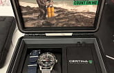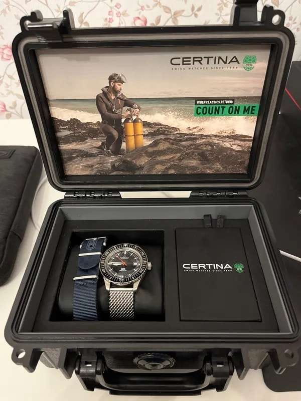 Оригинальный чёрный циферблат понравится ценителям ретро-дизайна. В комплекте с тканевым ремешком вы получаете дополнительный вариант из стали. Меняя их, вы можете экспериментировать с разными стилями. Уникальностью обладает не только аксессуар, но и упаковка, сделанная в виде бокса для дайвинга. Часы комплектуются автоматическим механизмом ETA Powermatic 80Powermatic 80Эксклюзивный калибр от швейцарской компании ETA с увеличенным запасом хода до 80 часов за счёт удлинённой заводной пружины. Характеризуется улучшенной системой спуска со сниженным трением. с 80-часовым запасом хода. Технология DS ConceptDS ConceptDouble Security Concept, обозначает двойную надёжность и безупречную точность часов Certina. Двойная система защиты подразумевает обеспечение максимальной устойчивости к ударам и высоких показателей водонепроницаемости.. Стекло с покрытием Nex scratchguard, устойчивым к царапинам. Вращающийся безельБезельВнешний ободок, закрепляющий стекло. В спортивных часах так называется поворотное кольцо с делениями на циферблате, выполняет роль таймера – замеряет отрезки времени на шкале. Неподвижный безель – элемент декора. Однонаправленно вращающийся безель на дайверских часах позволяет фиксировать моменты погружения и выныривания на поверхность.. Диаметр корпуса: 42,8 мм.
