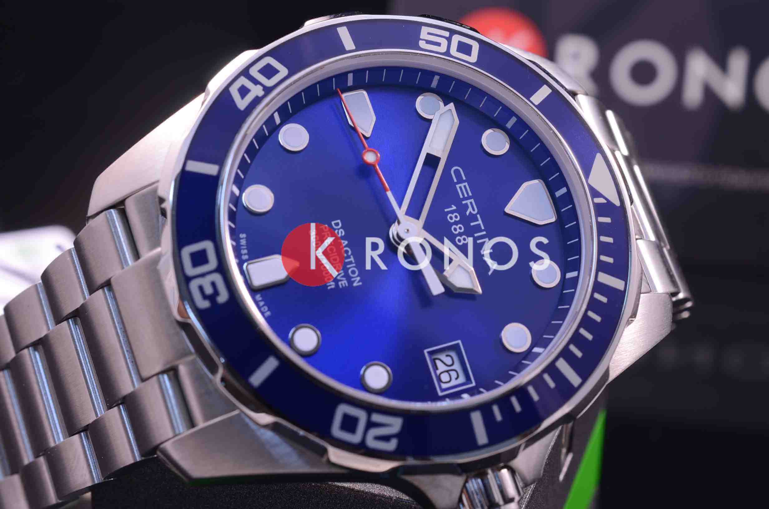 Часы отражают концепцию долговечности и практичности, использование инновационных материалов и высокоточного швейцарского калибра ETA F07.411 Precidrive™Precidrive™Инновационный кварцевый механизм Certina. Часы, оснащённые этим швейцарским калибром, приравниваются к точности к сертифицированным хронометрам, точность хода составляет +/-10 секунд в год. позволяет часам стильно выглядеть и сохранять безупречную работоспособность. Ударопрочный корпусУдаропрочный корпусМеханизм заключён в корпус, выполненный из современных материалов, устойчивых к ударам, механическим повреждениям и падению с высоты: инновационный пластик, карбон, нержавеющая сталь, титан. и браслет из стали, устойчивой к царапинам и повреждениям. Сапфировое стекло. Система Double SecurityDS ConceptDouble Security Concept, обозначает двойную надёжность и безупречную точность часов Certina. Двойная система защиты подразумевает обеспечение максимальной устойчивости к ударам и высоких показателей водонепроницаемости.. Вращающийся безельБезельВнешний ободок, закрепляющий стекло. В спортивных часах так называется поворотное кольцо с делениями на циферблате, выполняет роль таймера – замеряет отрезки времени на шкале. Неподвижный безель – элемент декора. Однонаправленно вращающийся безель на дайверских часах позволяет фиксировать моменты погружения и выныривания на поверхность.. Водонепроницаемость WR 300. Апертура даты, функция EOLEOLПредставляет собой систему, уведомляющую владельца часов о необходимости замены элемента питания. За 2 недели до полного разряда батарейки секундная стрелка перестаёт ходить чётко и начинает перепрыгивать на 3-4 деления.. «Умная» застёжка с удлинением для дайверовУдлинение для дайверовЗастёжка с удлинением для дайверов представляет собой безопасное крепление, которое позволяет надевать часы поверх гидрокостюма. Гибкая застёжка удлиняется на 1-2 миллиметра.. Диаметр корпуса: 41 мм.