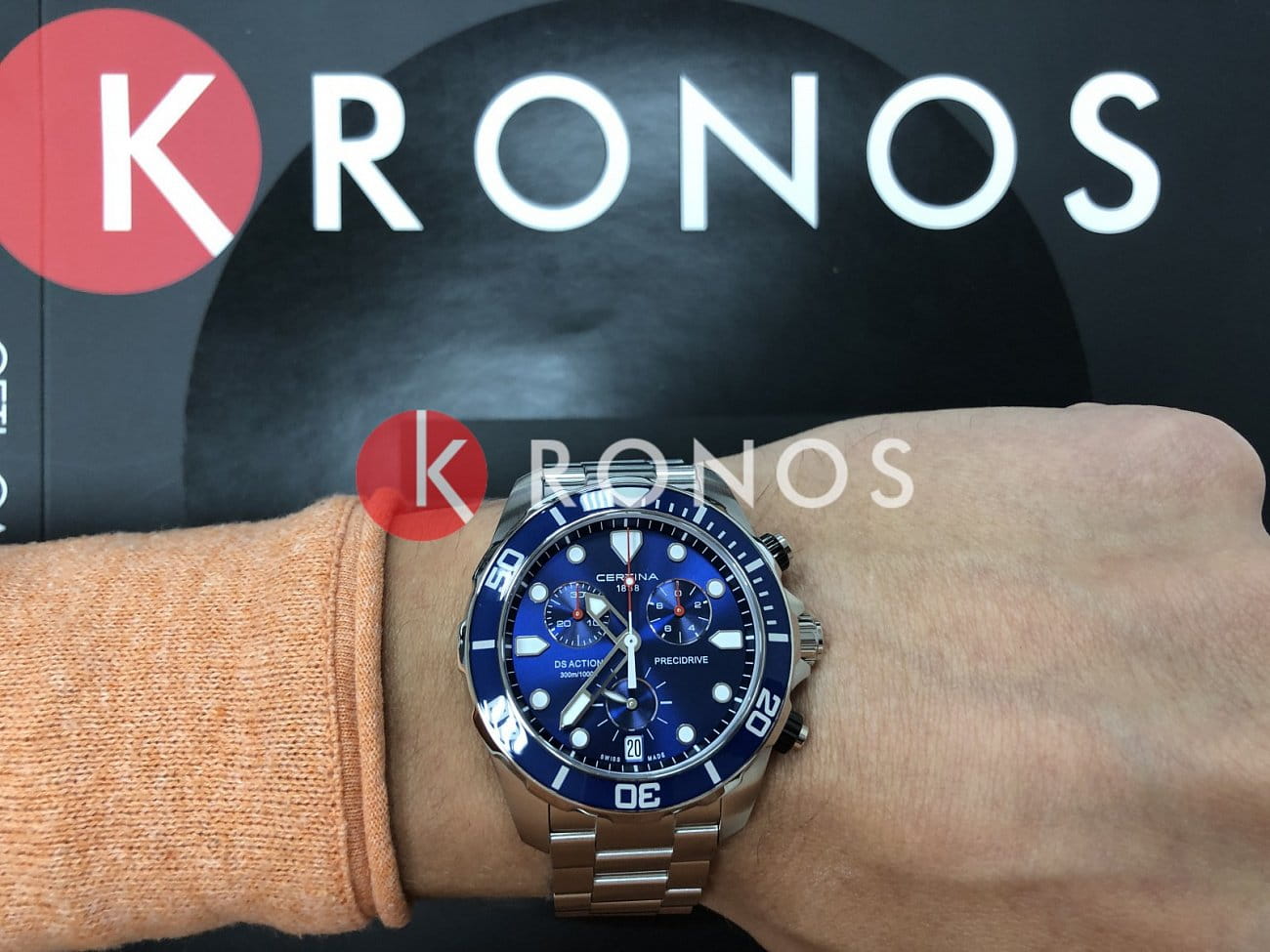 Брендовый хронографХронографФункция позволяет измерять отрезки времени с особой точностью: часы, минуты, секунды. Верным признаком хронографа является наличие на циферблате 3 дополнительных окошек-счётчиков. имеет привлекательную сине-серебристую расцветку, благодаря чему часы можно носить даже со строгими деловыми костюмами. Модель комплектуется кварцевым механизмом ETA Precidrive™Precidrive™Инновационный кварцевый механизм Certina. Часы, оснащённые этим швейцарским калибром, приравниваются к точности к сертифицированным хронометрам, точность хода составляет +/-10 секунд в год. с высокой точностью хода. Циферблат защищает сапфировое стекло, имеющее антибликовое покрытие. Яркая люминесцентная подсветкаЛюминесцентное покрытиеПозволяет считывать показания времени в темноте. Производители наносят на стрелки, часовые индексы, безель или поверхность циферблата светонакопительный состав, дающий холодное свечение.. БезельБезельВнешний ободок, закрепляющий стекло. В спортивных часах так называется поворотное кольцо с делениями на циферблате, выполняет роль таймера – замеряет отрезки времени на шкале. Неподвижный безель – элемент декора. Однонаправленно вращающийся безель на дайверских часах позволяет фиксировать моменты погружения и выныривания на поверхность. с цветным PVD-покрытиемPVDУльтратонкое покрытие наносится в технике вакуумного напыления, сочетает в себе нитрид титана особой прочности со слоем золота или оксида хрома. Несёт в себе декоративную или защитную функцию.. Водостойкость 300 метров. Секундомер, отображение числа. Индикатор EOLEOLПредставляет собой систему, уведомляющую владельца часов о необходимости замены элемента питания. За 2 недели до полного разряда батарейки секундная стрелка перестаёт ходить чётко и начинает перепрыгивать на 3-4 деления.. Диаметр корпуса: 43 мм.